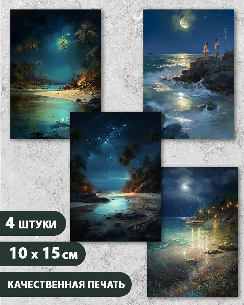 Набор открыток Морской пейзаж, Лунная ночь, 10.5 см х 15 см, 4 шт, InspirationTime, на подарок и в коллекцию