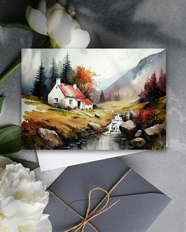 Набор открыток "Пейзаж с домиком", 10.5 см х 15 см, 4 шт, InspirationTime, на подарок и в коллекцию