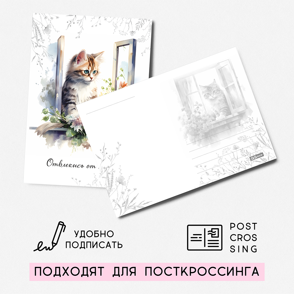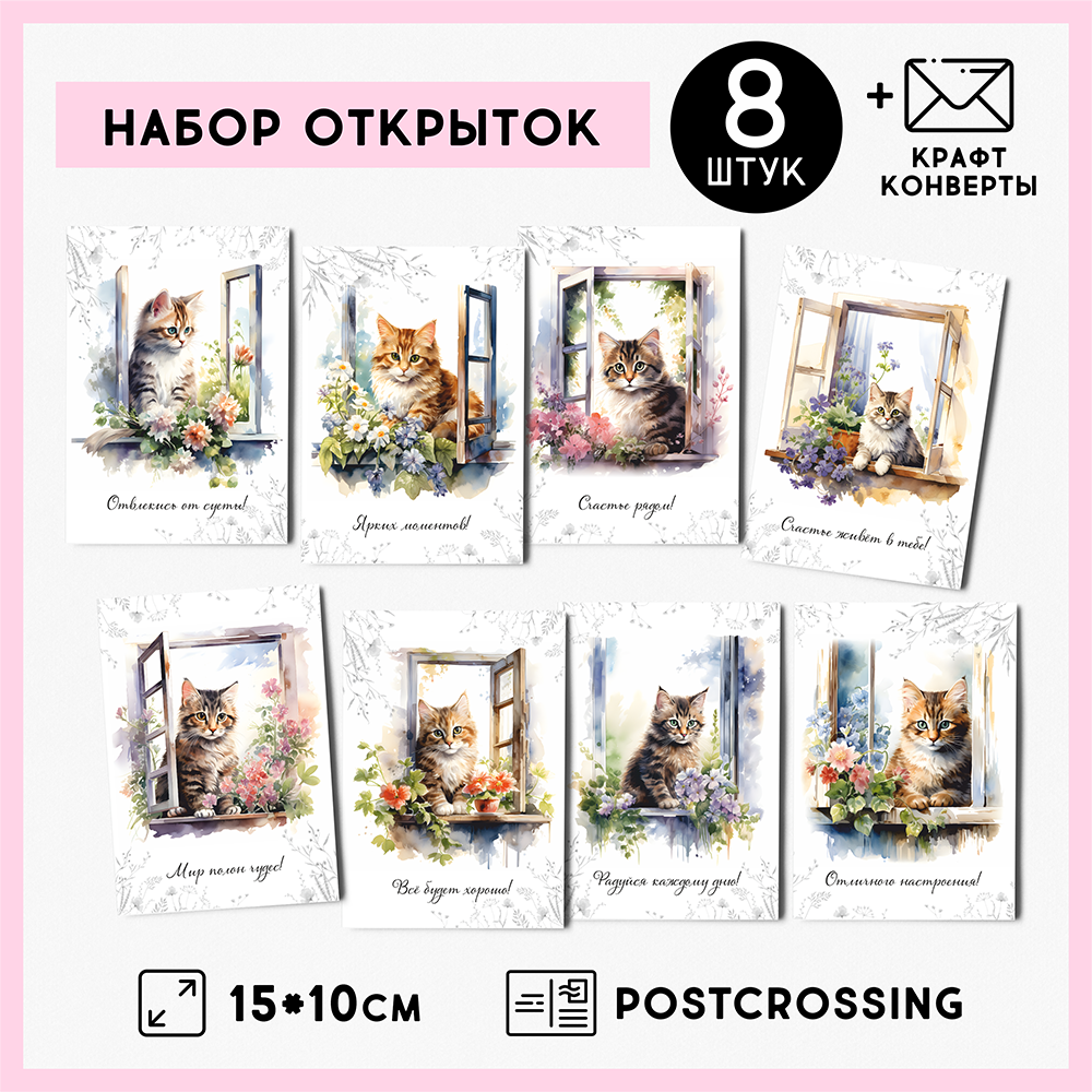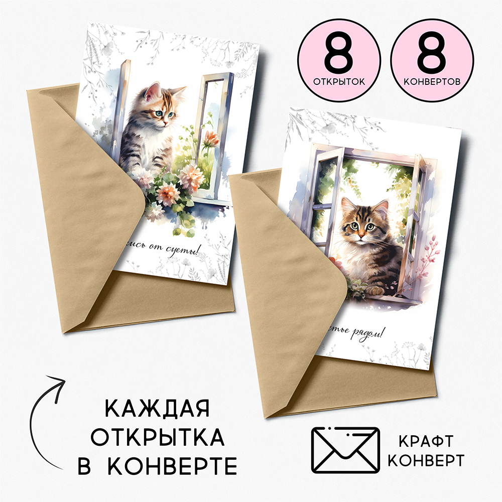 Набор открыток "Котята на окошке" с крафт конвертами, 8 штук, размер А6 QQ_Shop интересное: