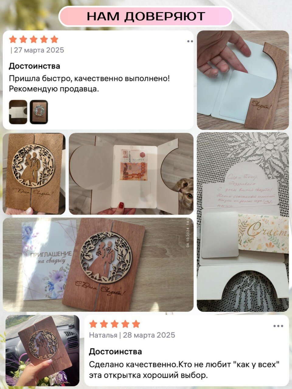 Ниже Вы можете прочитать отзывы на Открытка на свадьбу для денег l Купюрница деревянная, 17х12 см, ознакомится с подробными характеристиками, посмотреть интересные обзоры и фотографии на Открытка на свадьбу для денег l Купюрница деревянная, 17х12 см.
