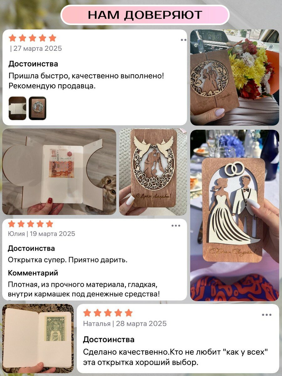 Ниже Вы можете прочитать отзывы на Деревянная открытка для денег на свадьбу l Купюрница из дерева, 17х10 см, ознакомится с подробными характеристиками, посмотреть интересные обзоры и фотографии на Деревянная открытка для денег на свадьбу l Купюрница из дерева, 17х10 см.