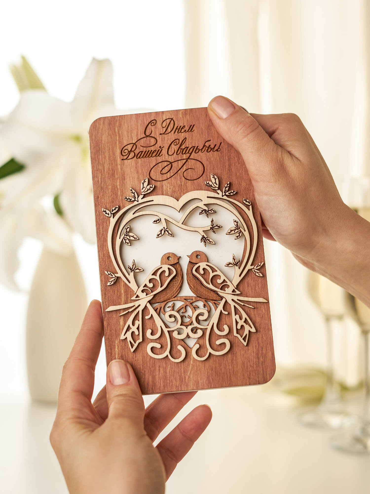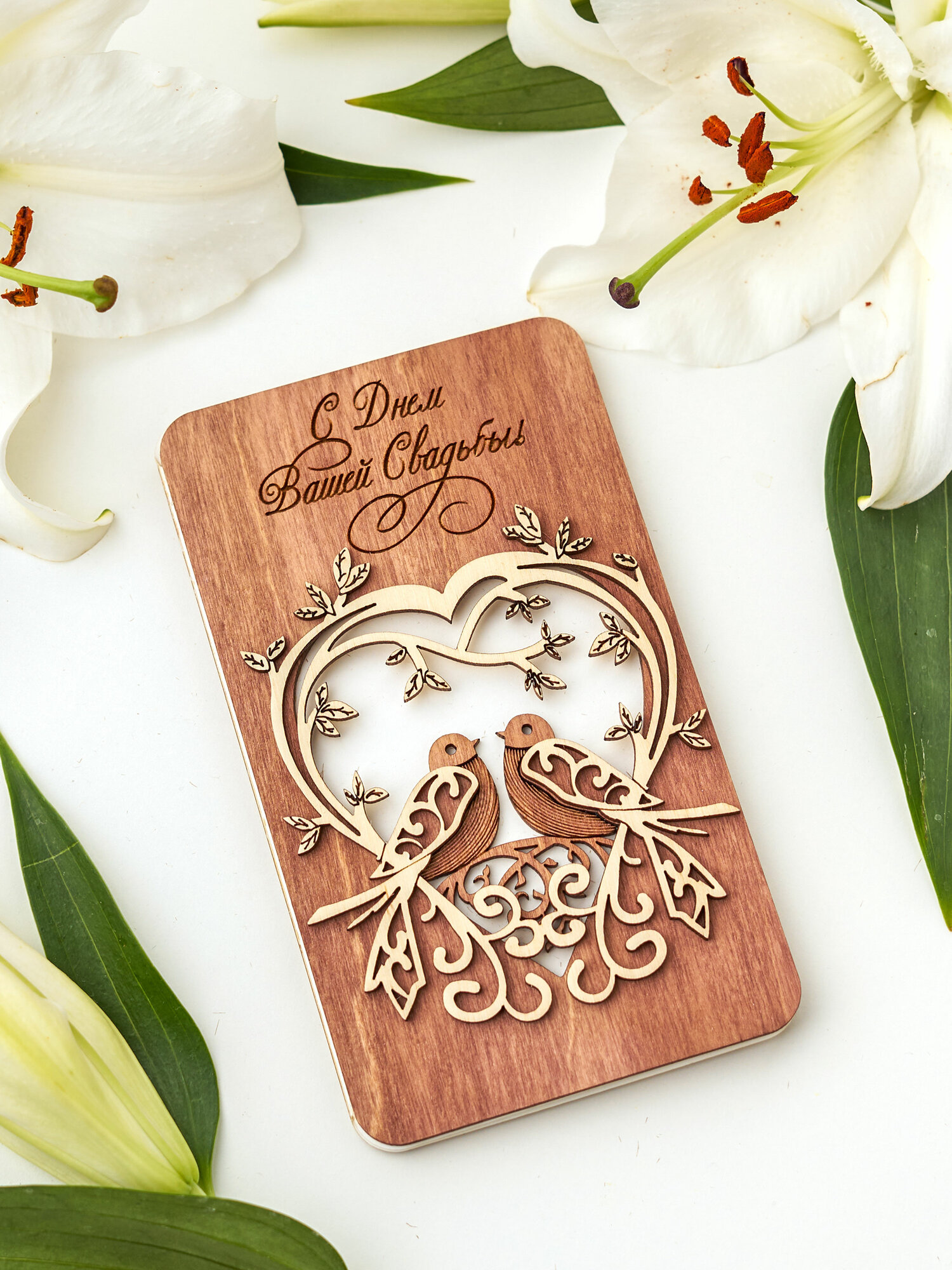 Купить Деревянная открытка С Днем Свадьбы l Подарок молодоженам, 17х10 см