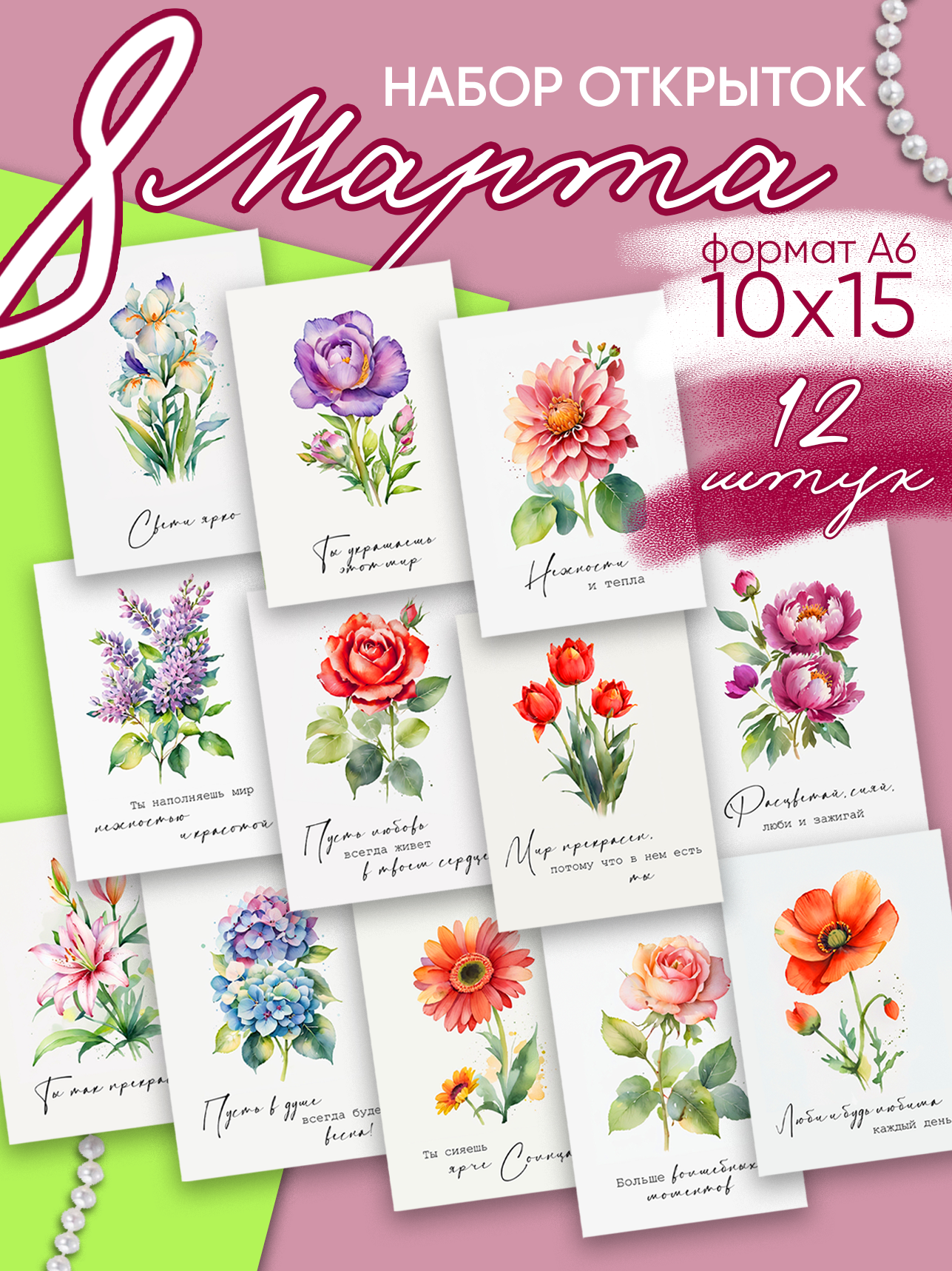 Открытки набор 8 марта 12 шт с пожеланиями интересное:
