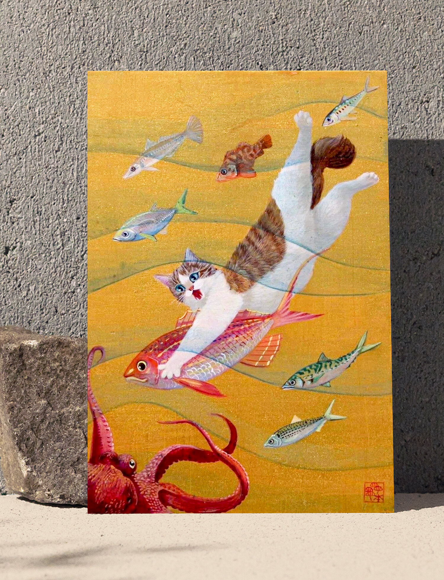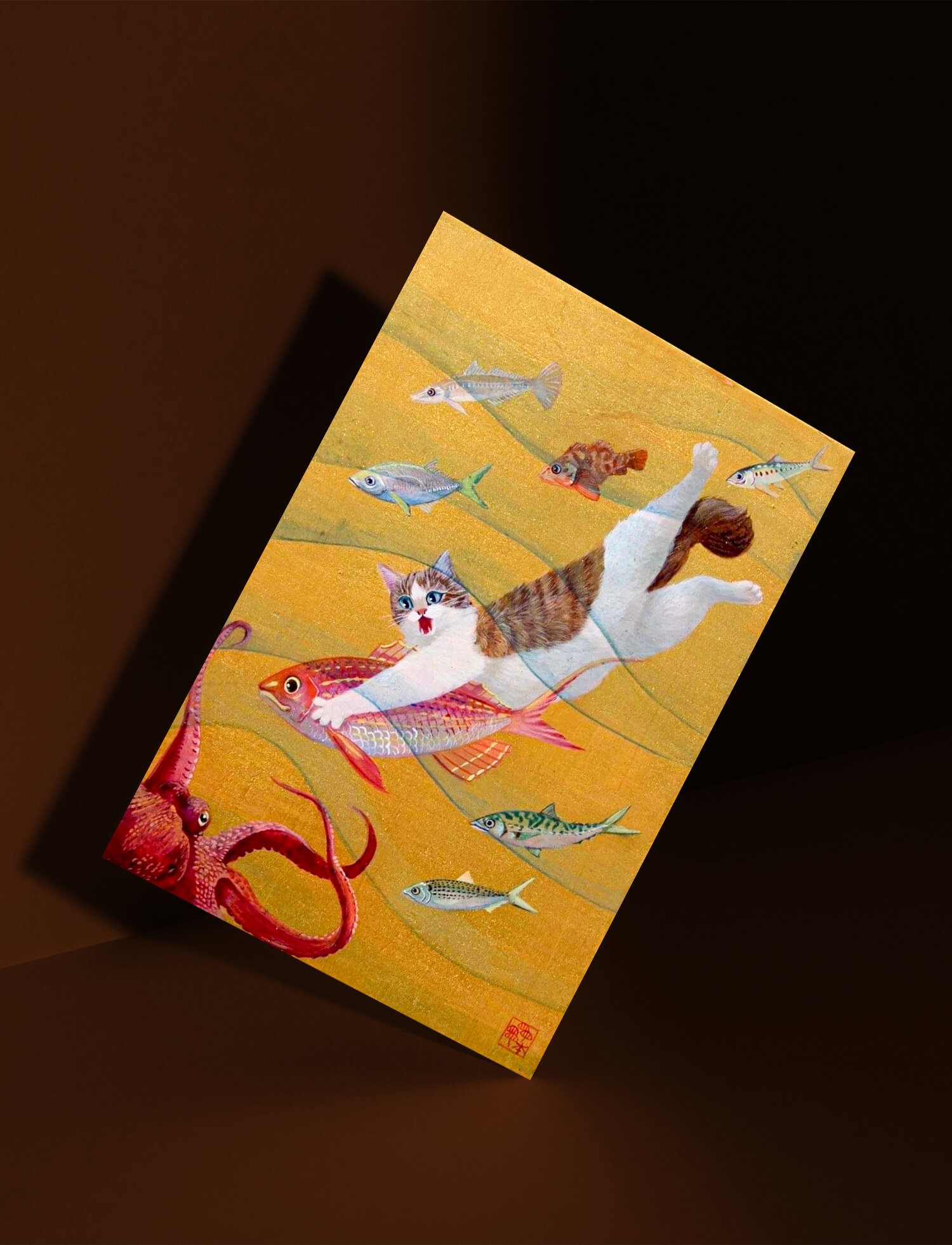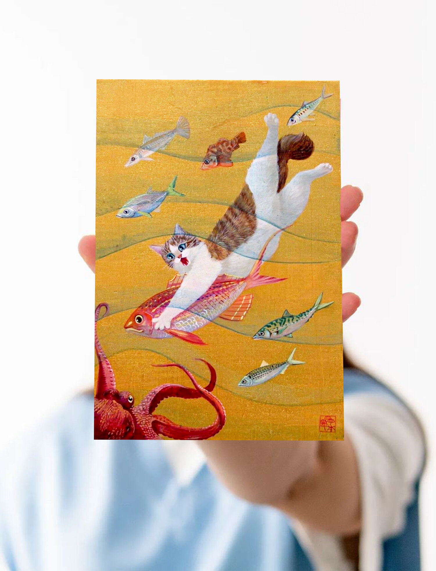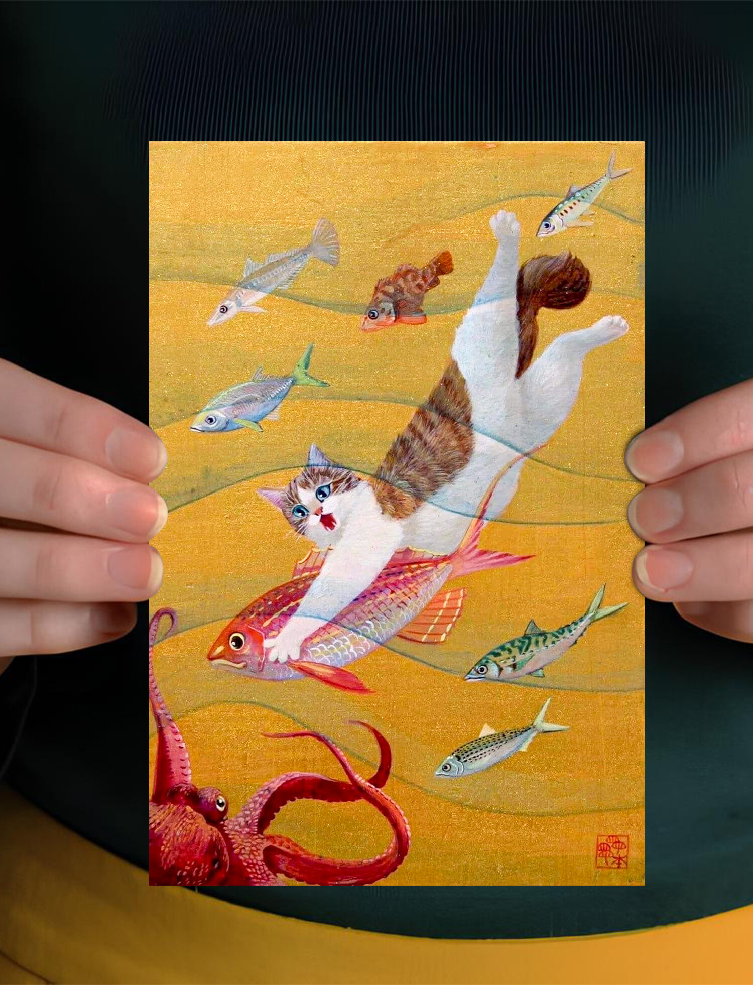 "Котик, японская классика" открытка (подходит под рамку 10х15см, плотная бумага, живопись) интересное:
