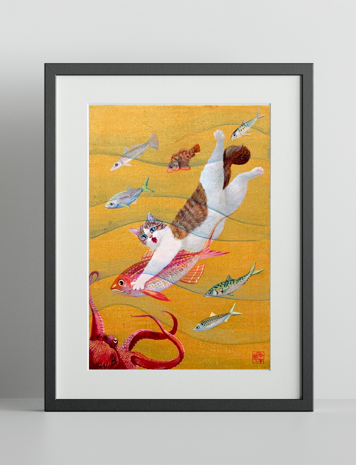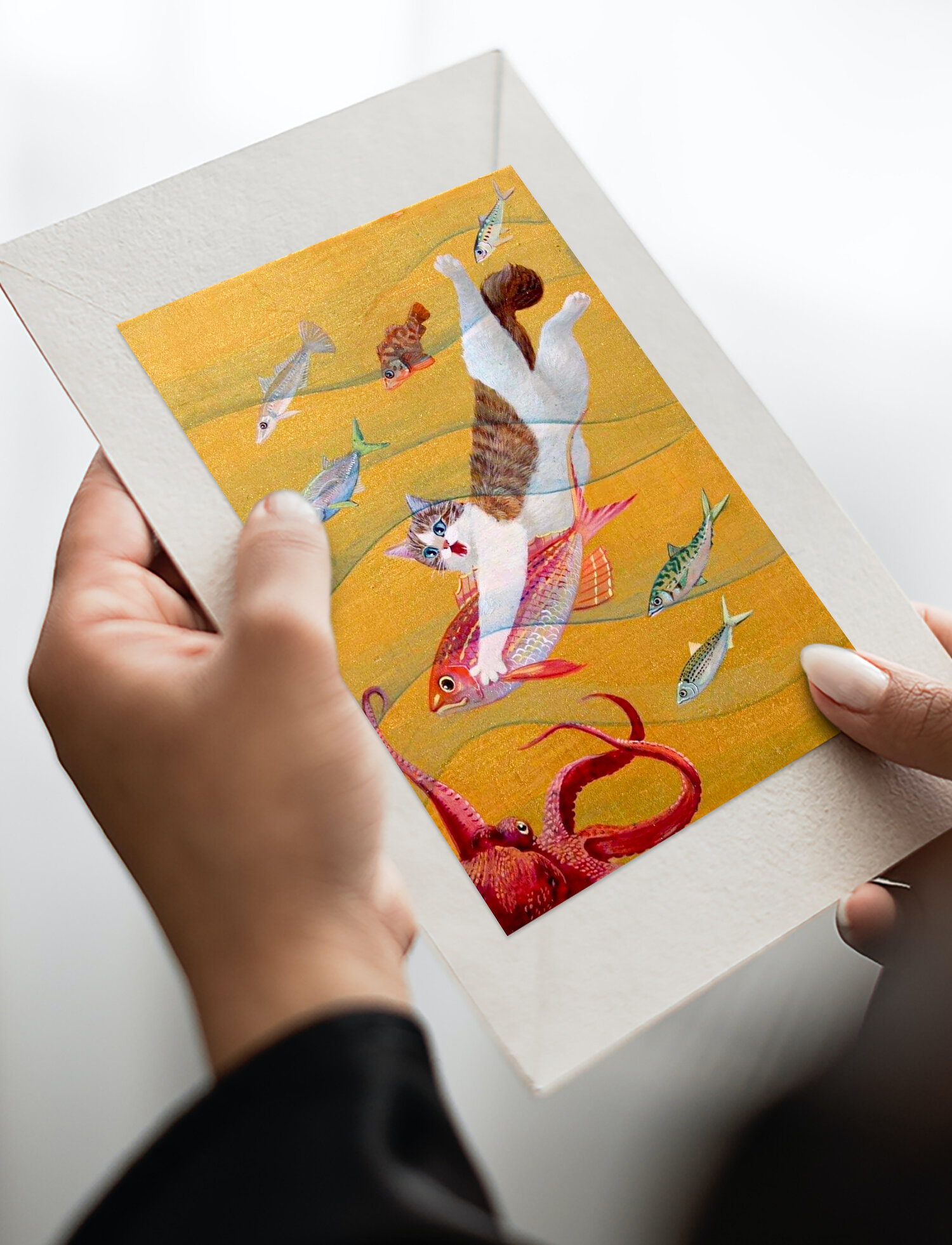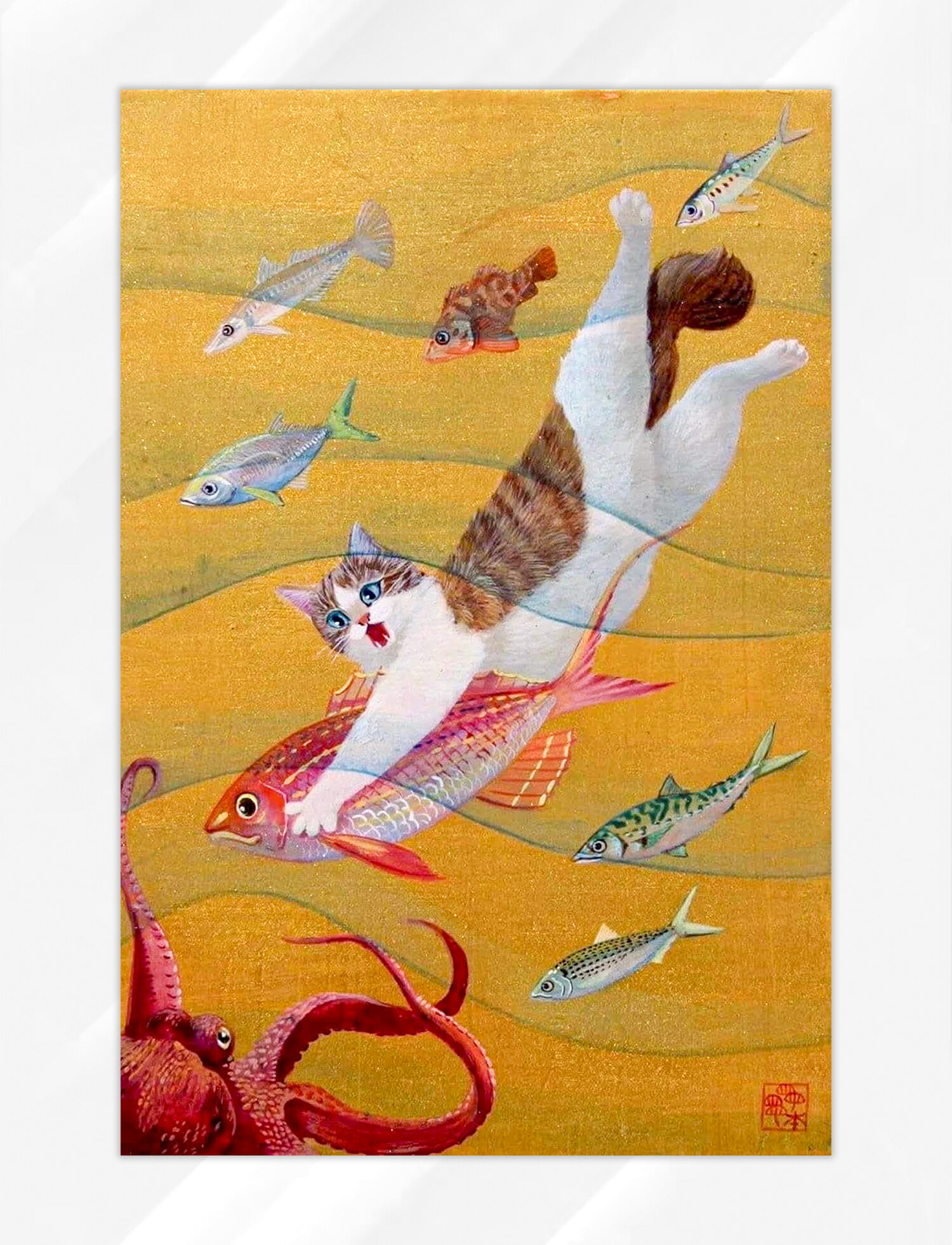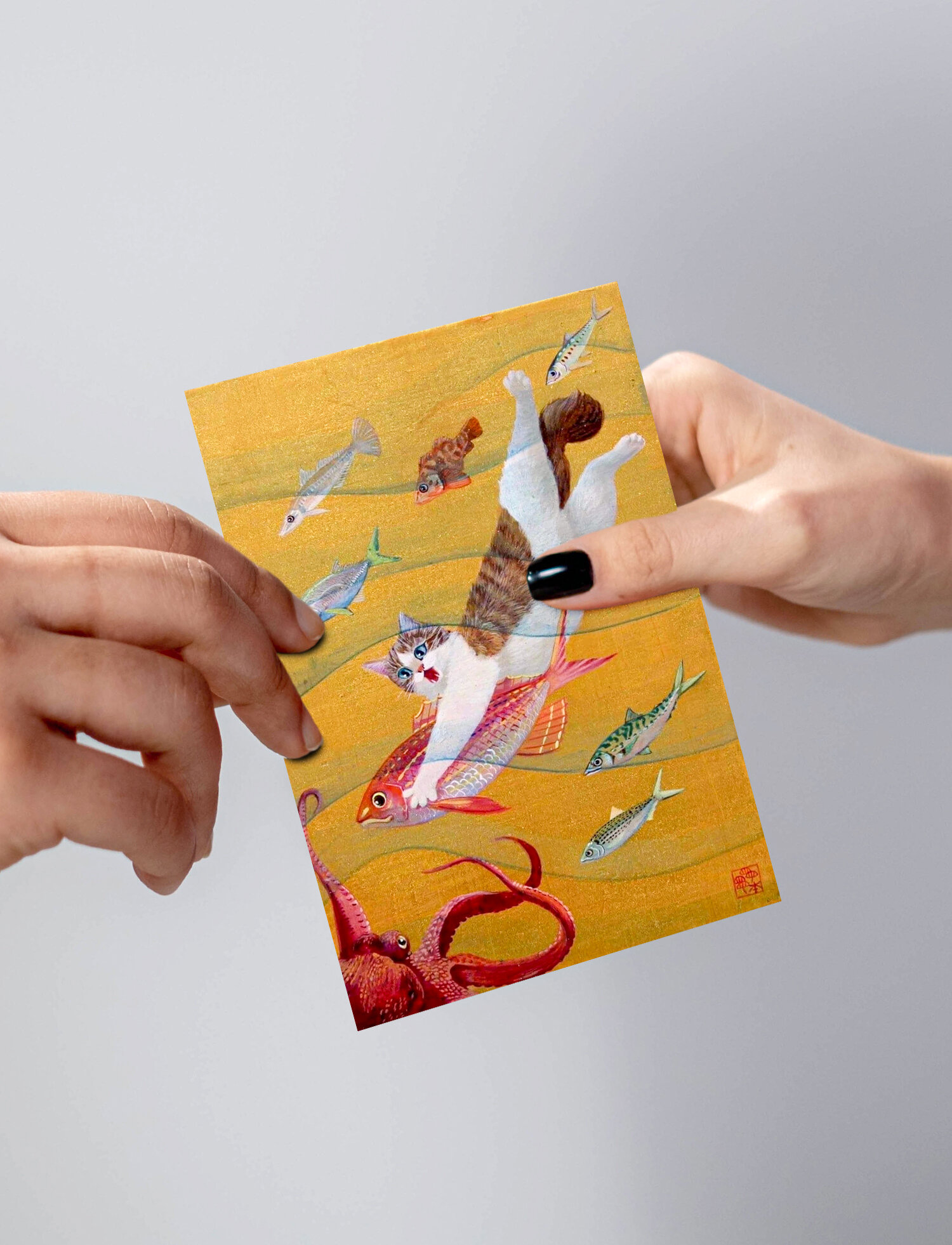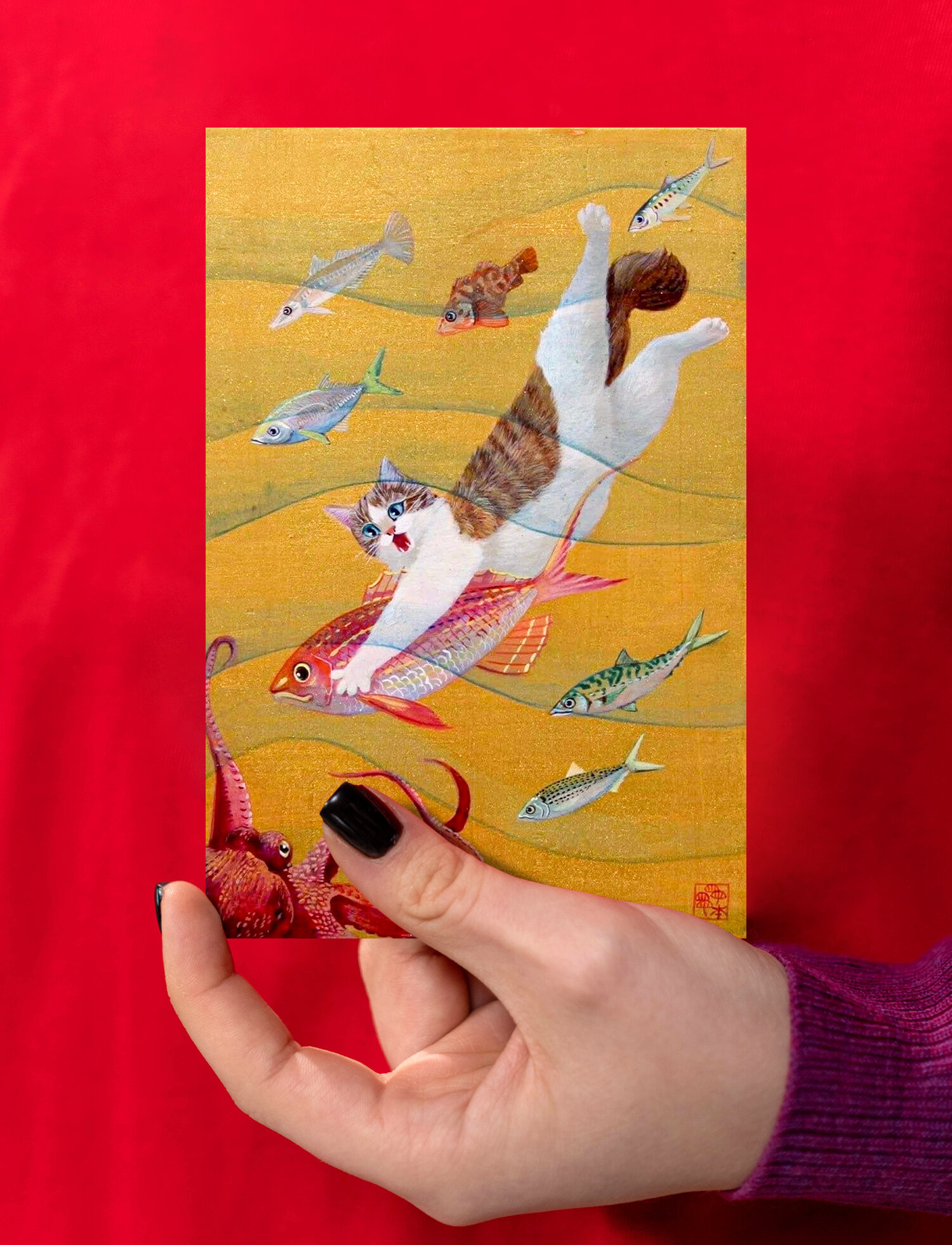 "Котик, японская классика" открытка (подходит под рамку 10х15см, плотная бумага, живопись) интересное: