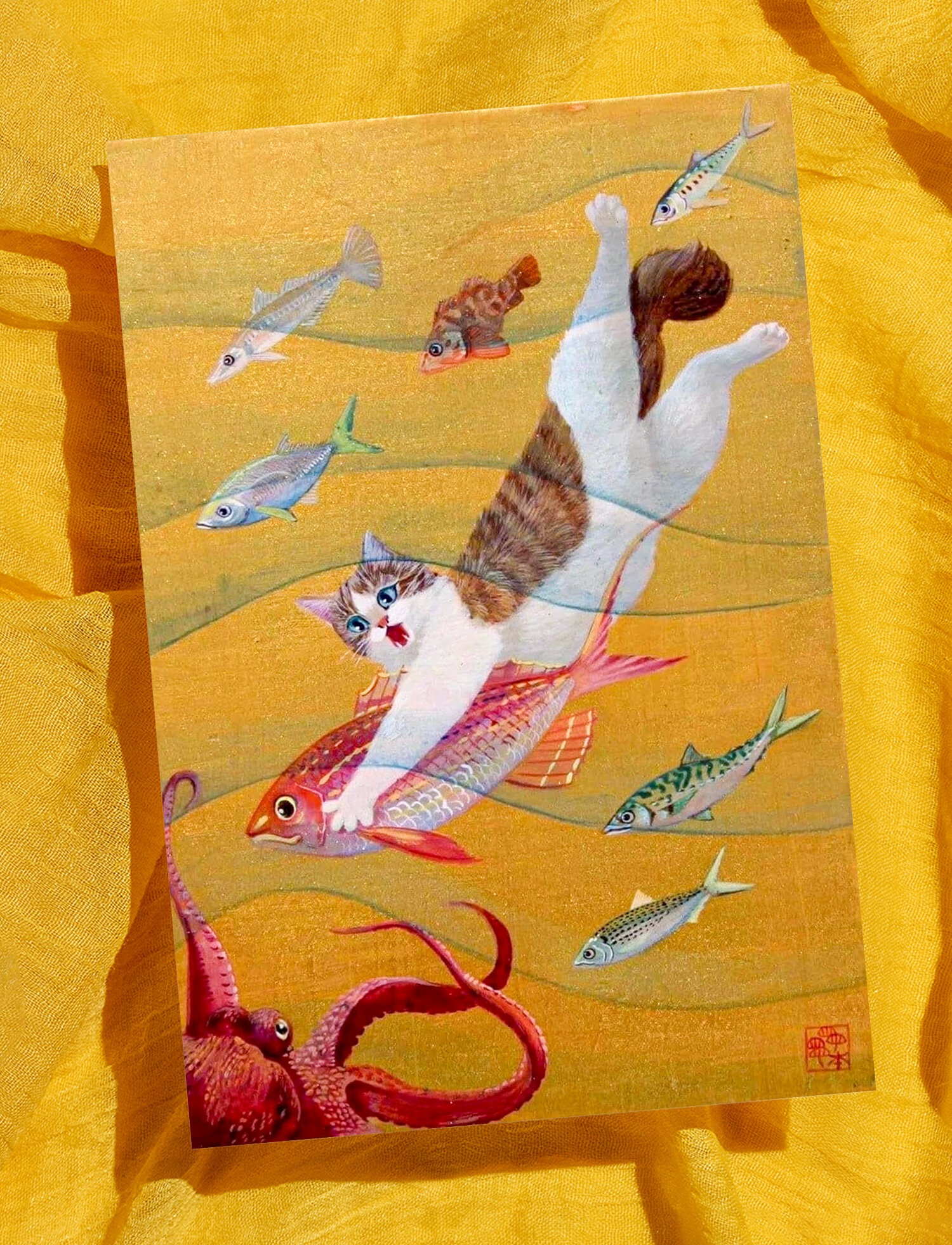 Купить "Котик, японская классика" открытка (подходит под рамку 10х15см, плотная бумага, живопись)