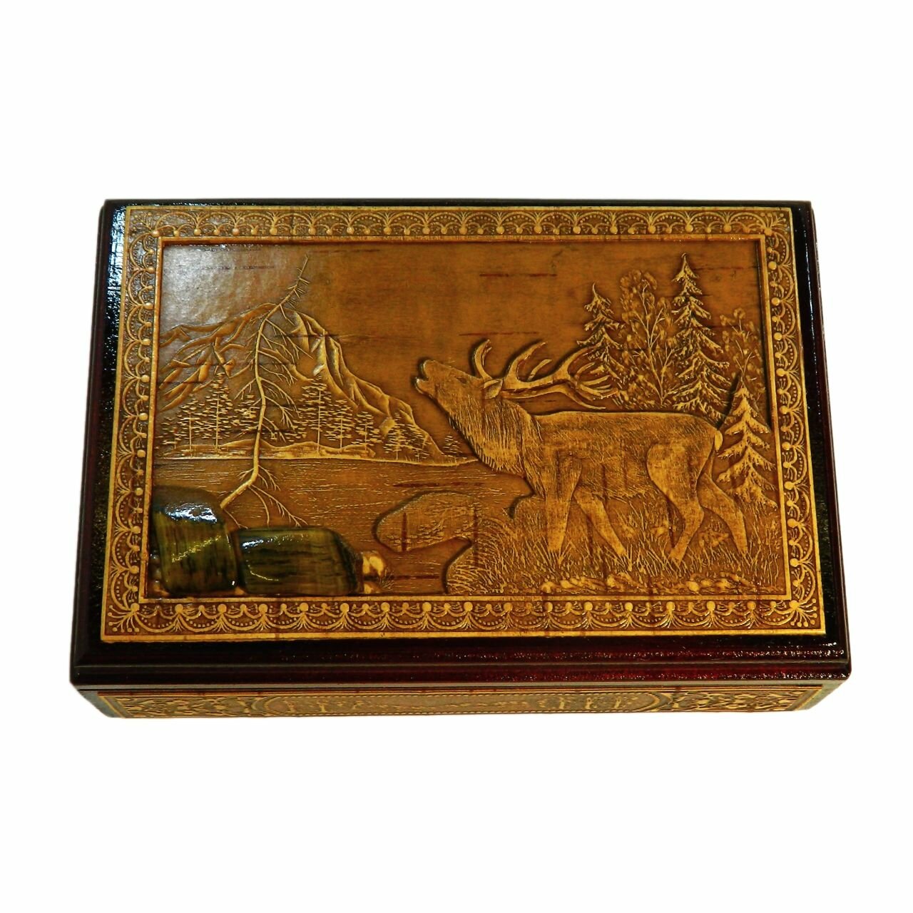 Купить Шкатулка "Олени с камнем", дерево, береста, родонит, ручная, авторская, 14.5x10x5 см