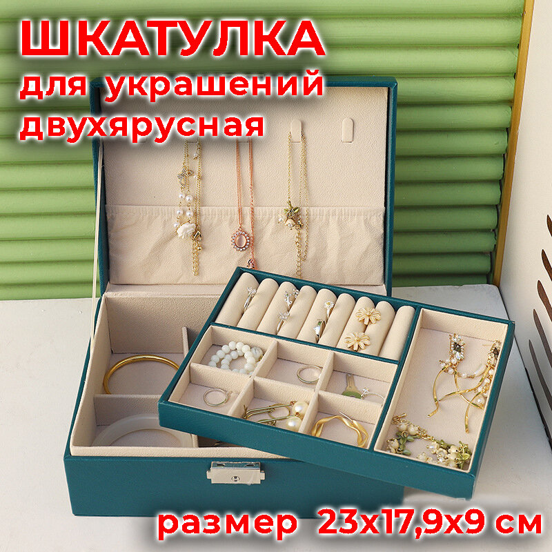 Шкатулка для украшений, размер 23х17,5х9 см, 2 яруса, цвет темно-зеленый