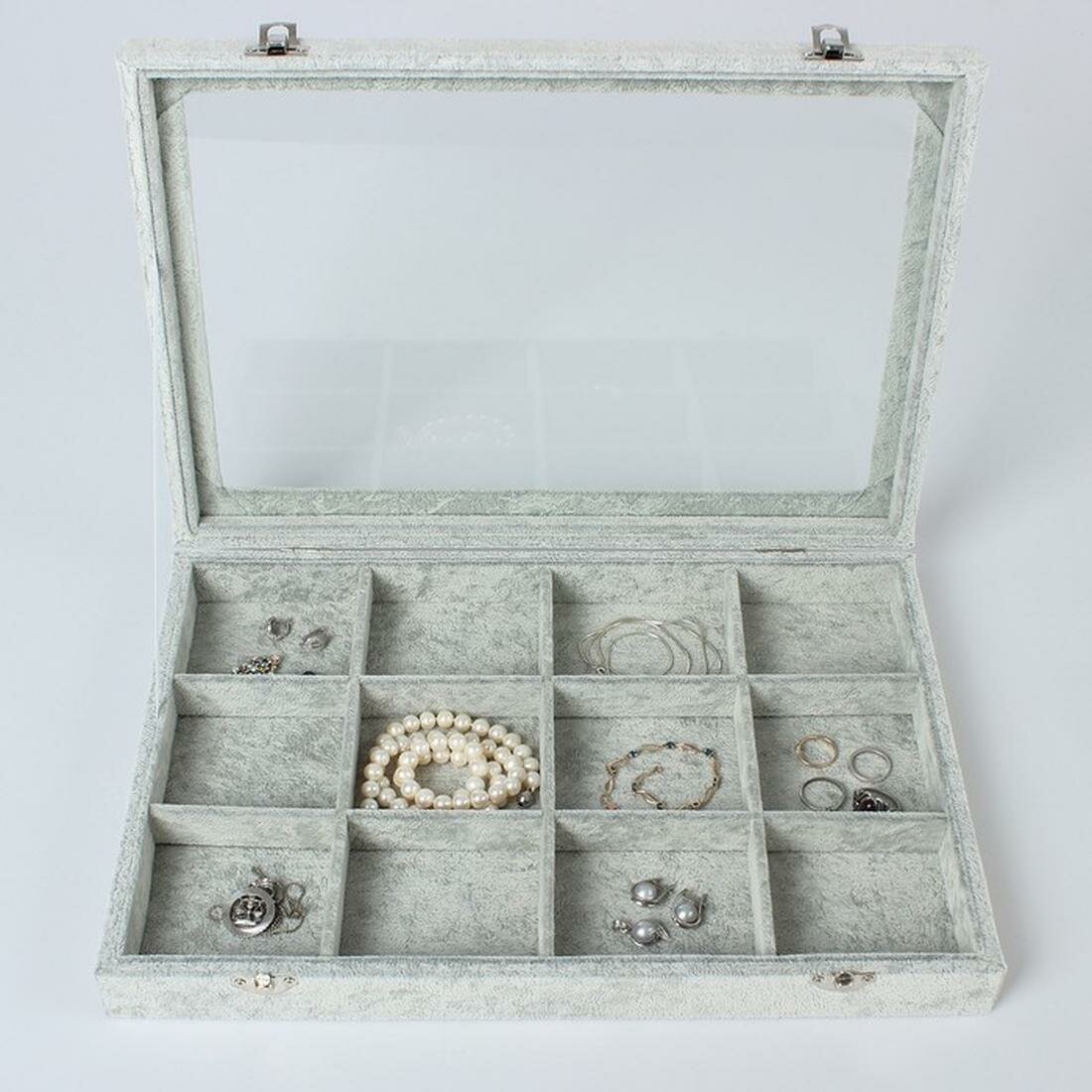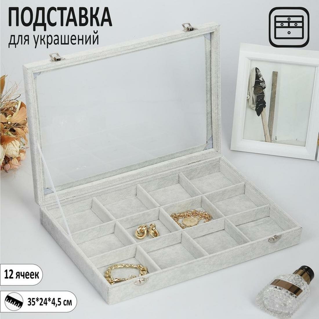 Подставка для украшений QF «Шкатулка» 12 ячеек, 35×24×4,5, стеклянная крышка, цвет серый интересное: