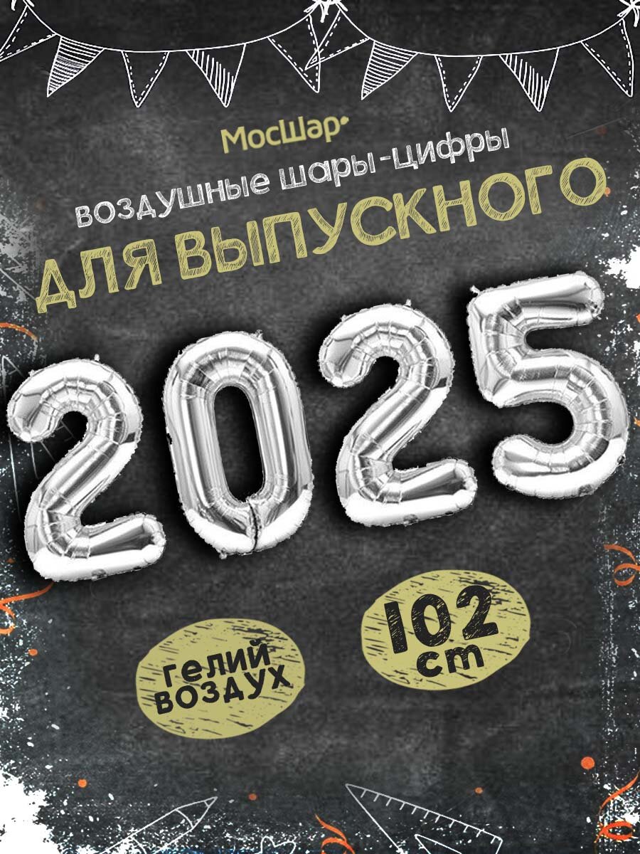 Купить Воздушные шары Мосшар "2025", серебро, 102 см, фольгированные, глянцевые
