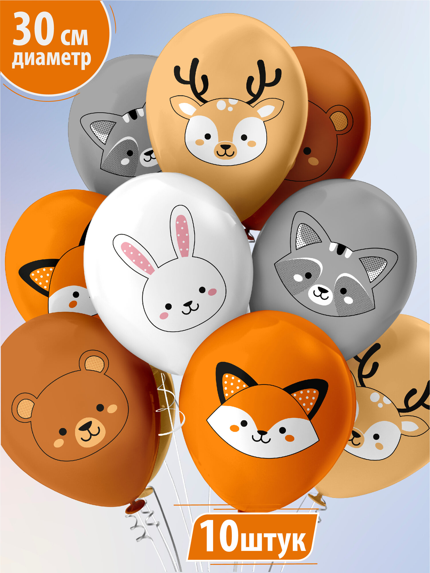 Купить Шарики воздушные для детей с рисунком лисичка, зайка, мишка, олененок, енот "Лесные звери" 10 шт