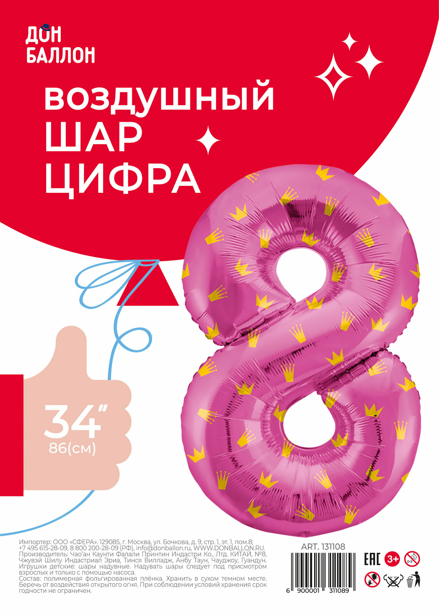 Воздушный шар фольгированный Falali Цифра 8, Золотые короны, розовый, 86 см интересное: