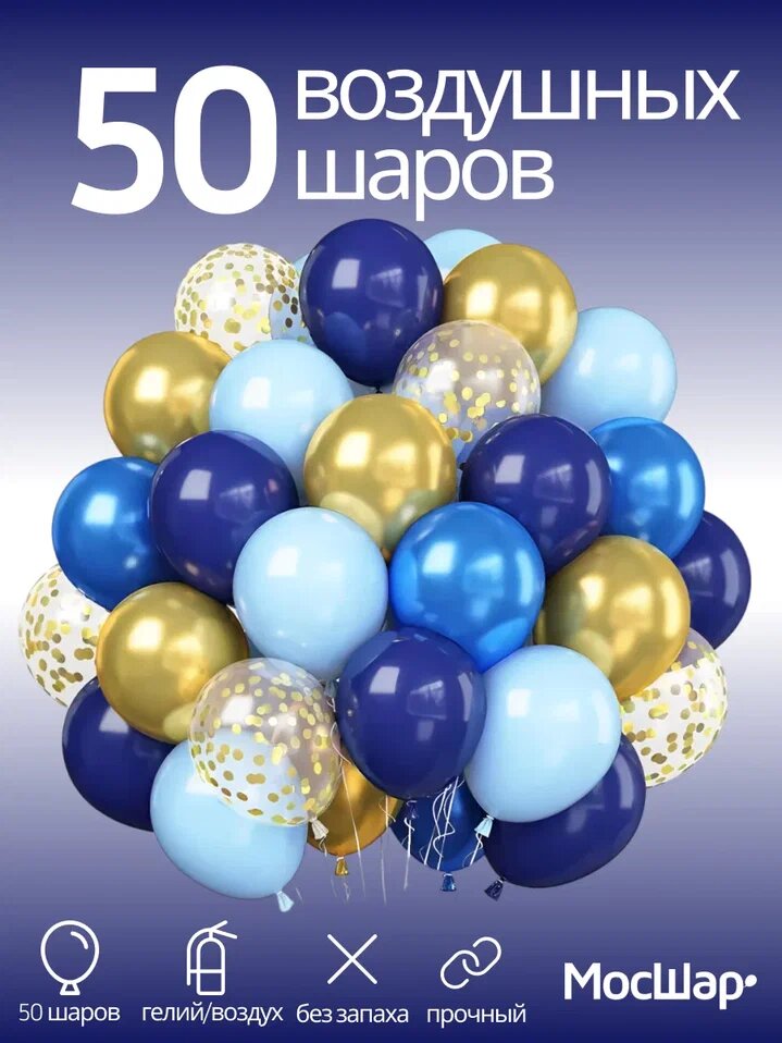 Купить Воздушные шары МосШар, 50 штук, сине-голубые с конфетти, диаметр 30см