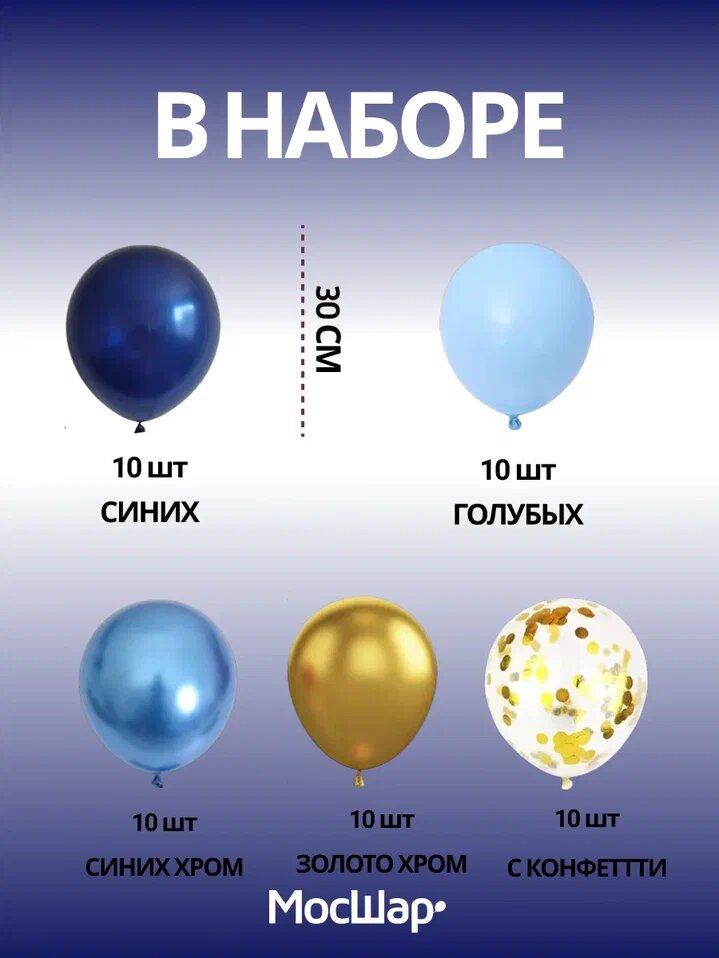 СохранитьВоздушные шары МосШар, 50 штук, сине-голубые с конфетти, диаметр 30см интересное: