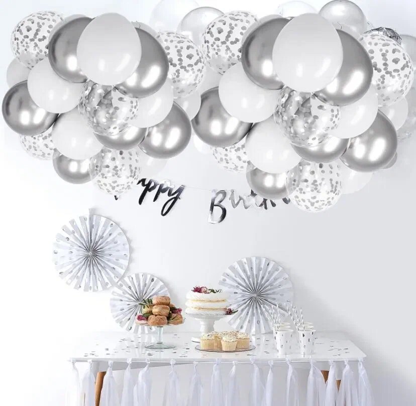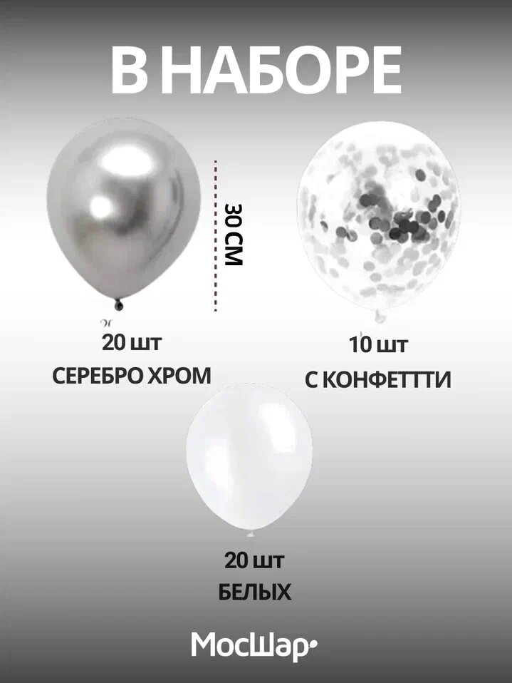 Купить Воздушные шары МосШар, 50 штук, бело-серебряный с конфетти, диаметр 30см
