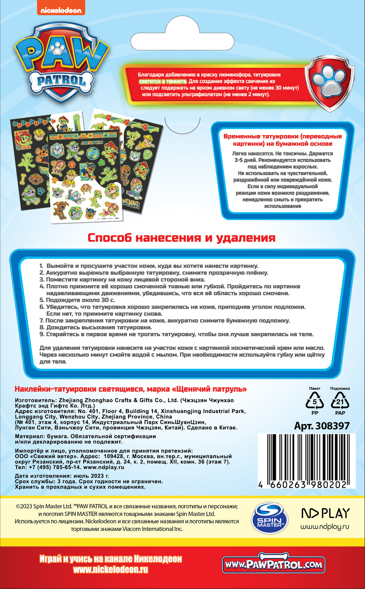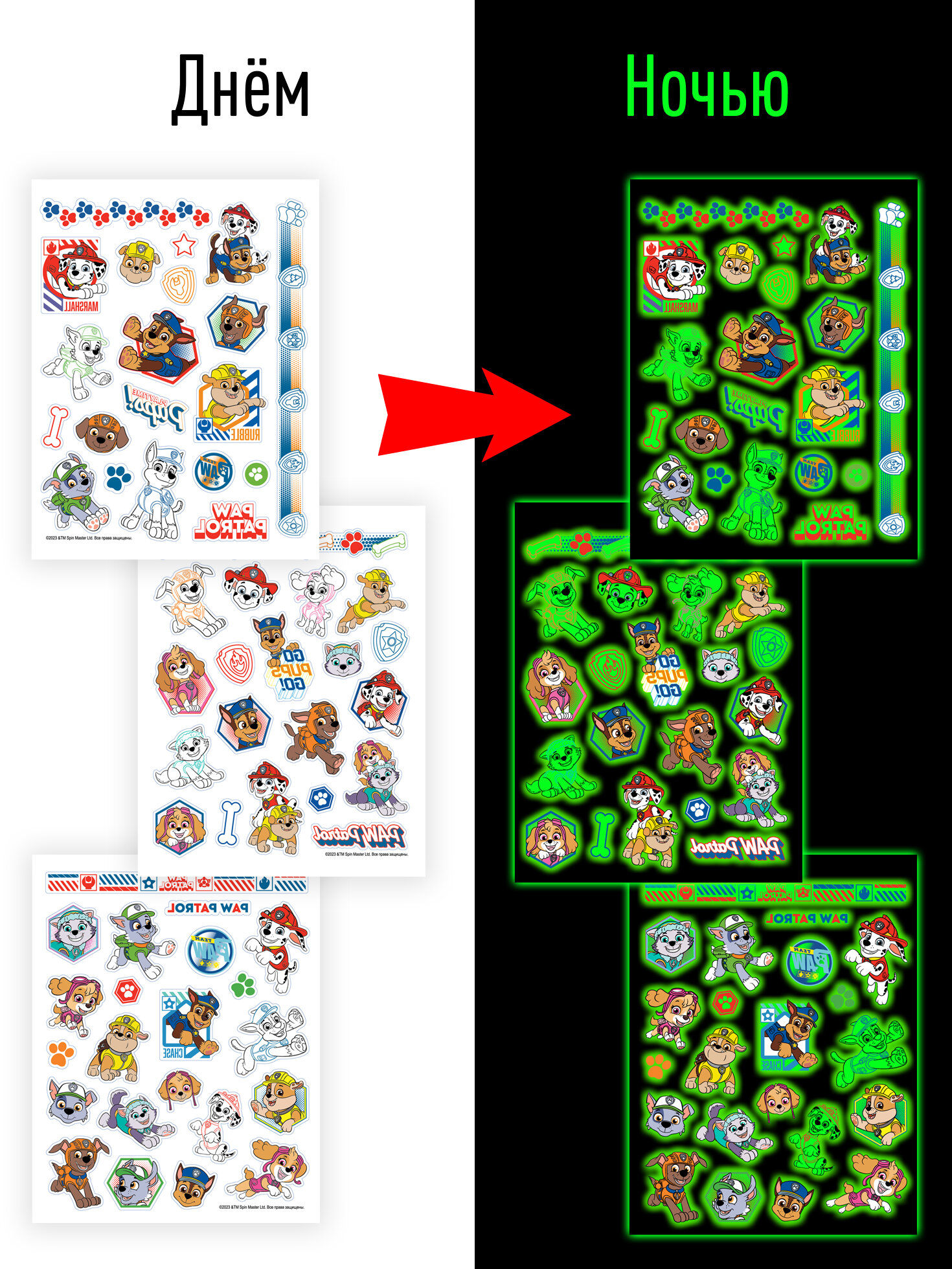 Наклейки - татуировки светящиеся "Щенячий патруль", 3 листа, диз. 3 ND Play
