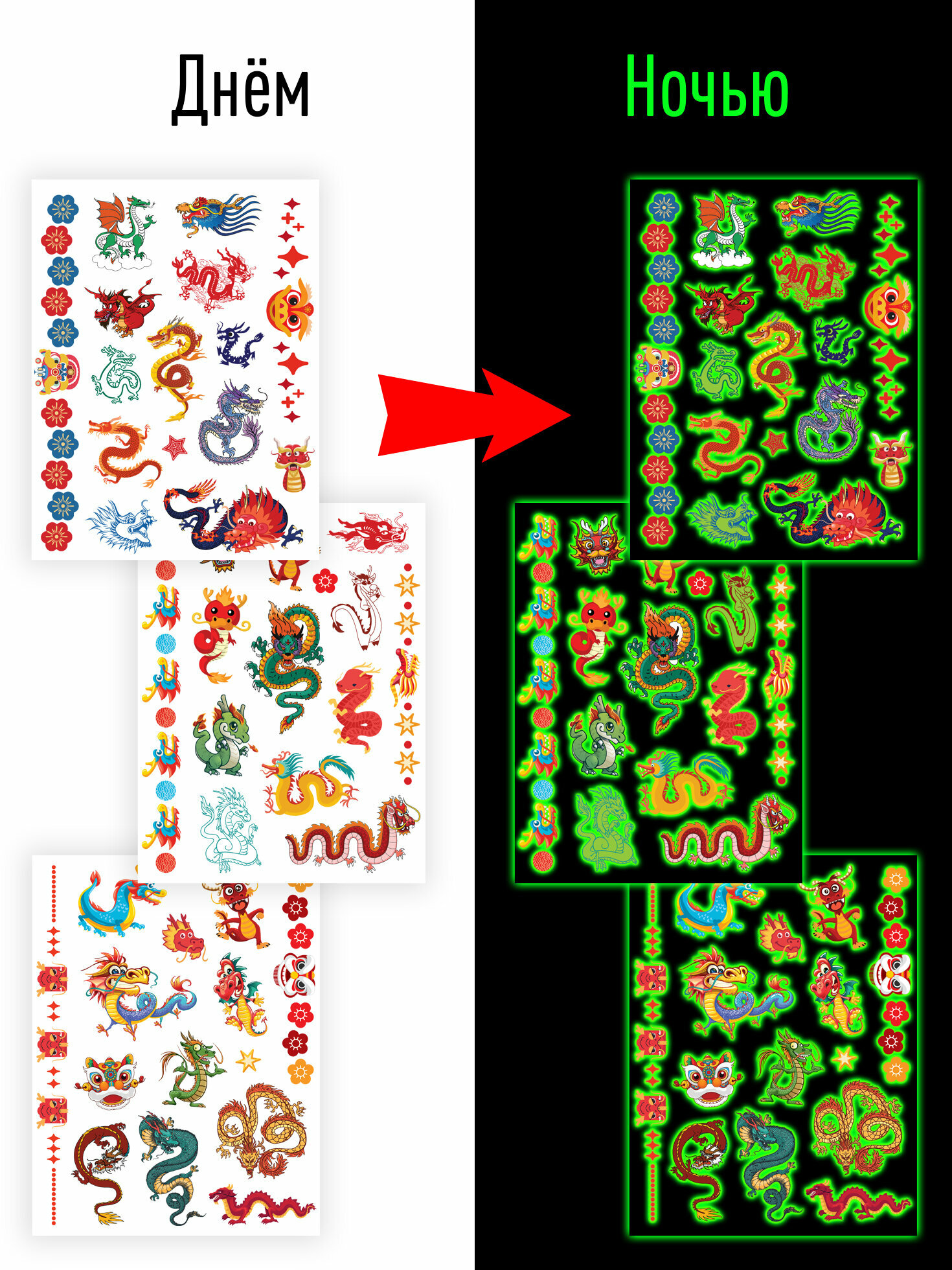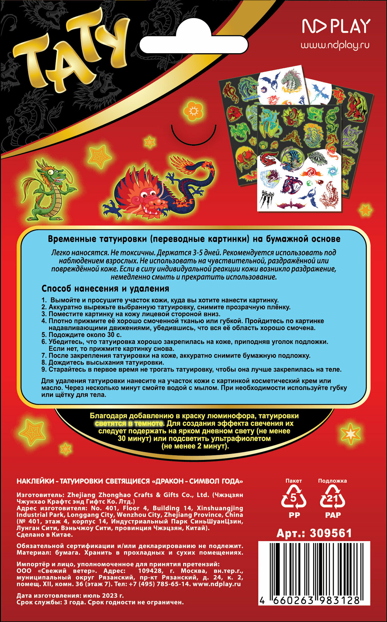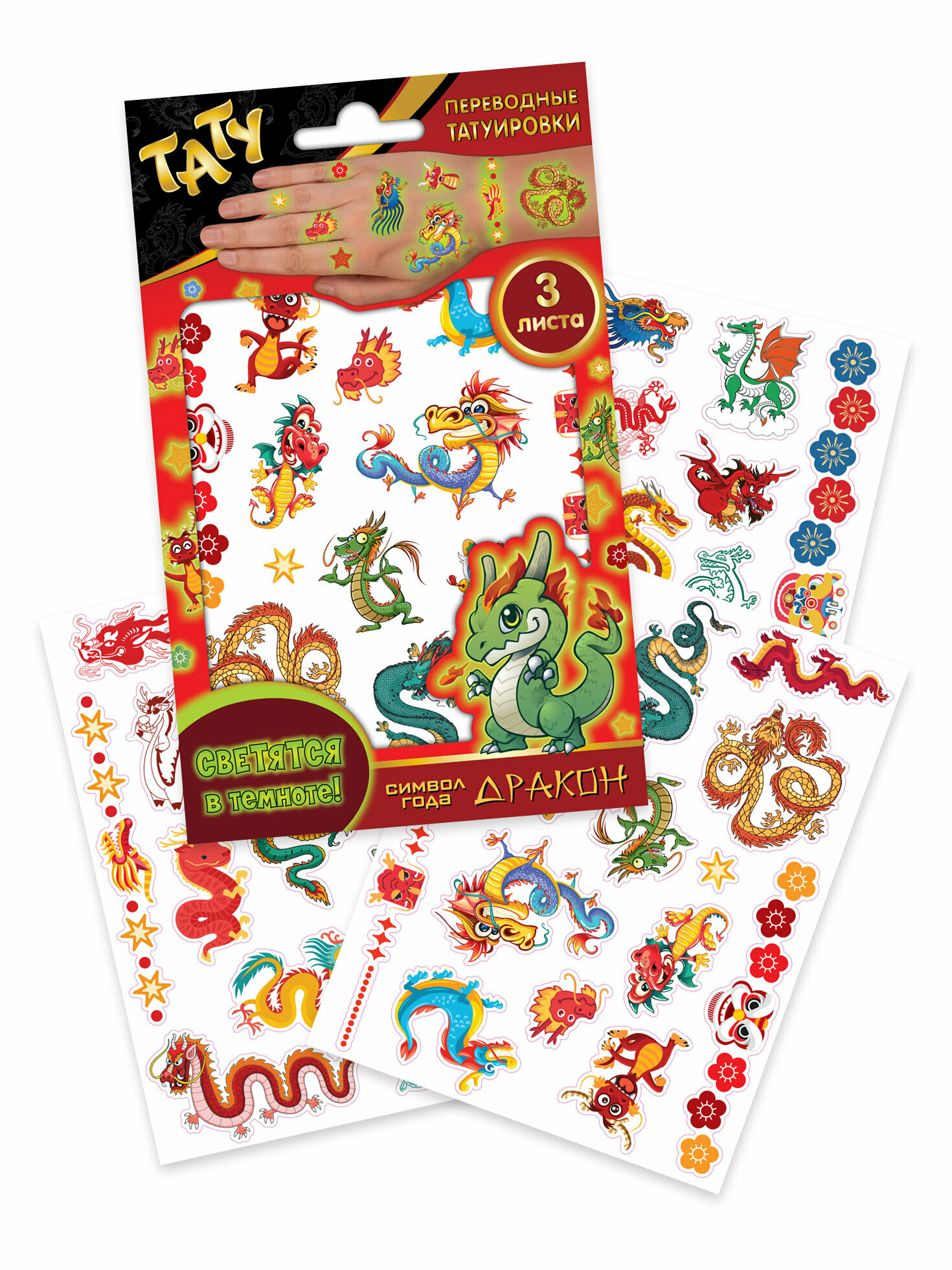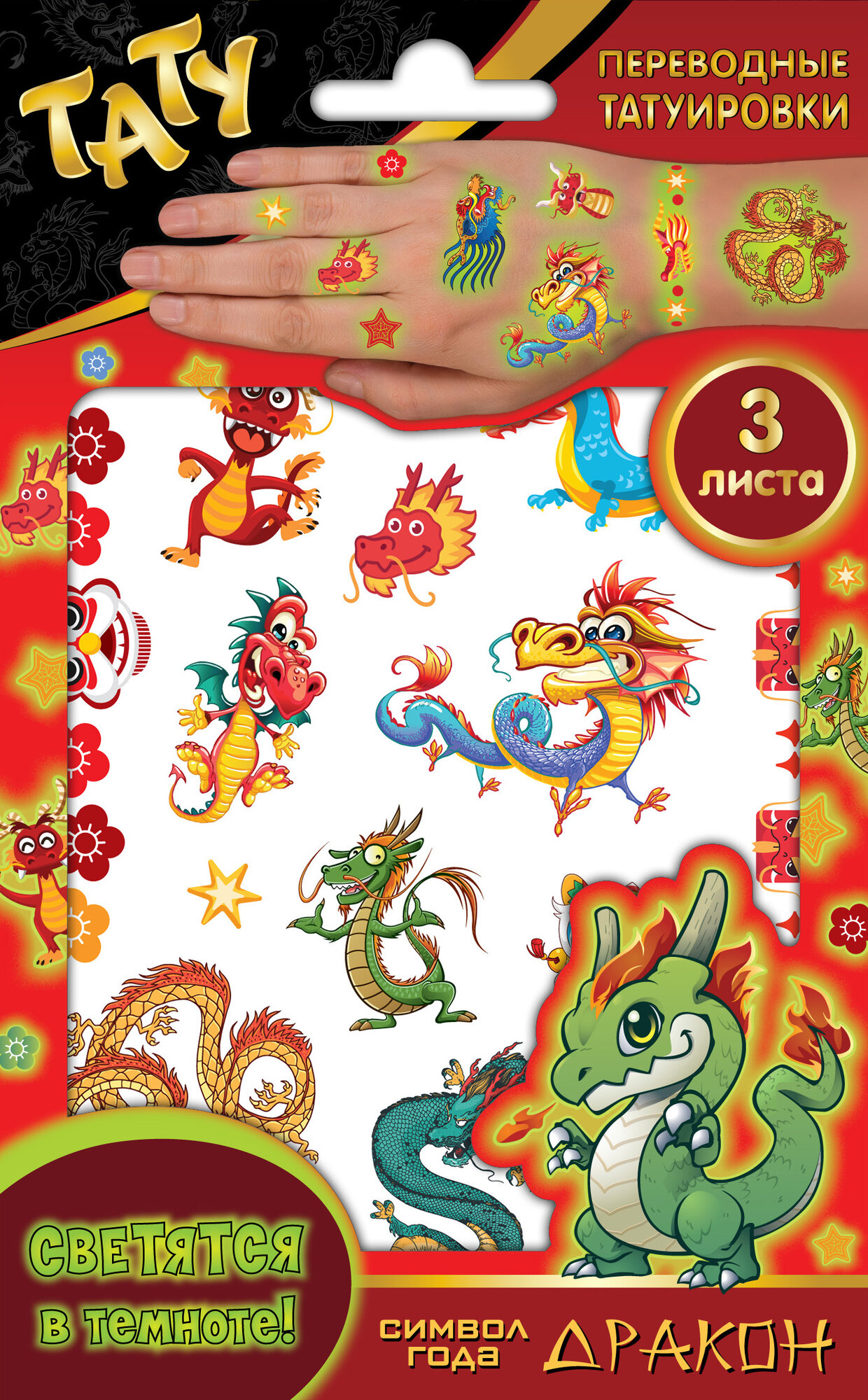 Купить Наклейки - татуировки светящиеся "Дракон - Символ года", 3 листа ND Play