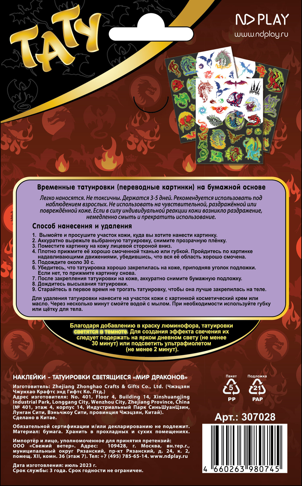 Наклейки - татуировки светящиеся "Дракон - Символ года", 3 листа ND Play
