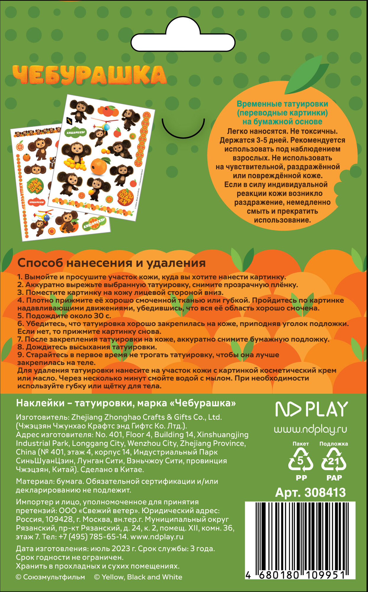 Купить Наклейки - татуировки "Чебурашка", 2 листа ND Play