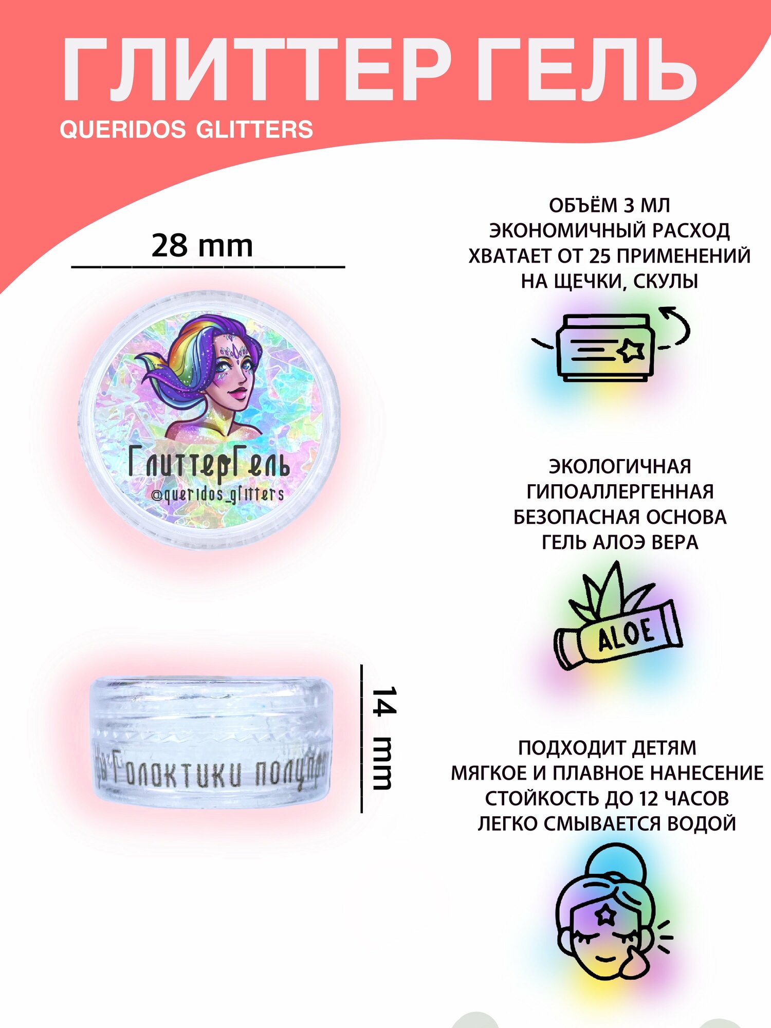 Queridos Glitters ГлиттерГель. Блёстки для лица и тела. Цвет "Рейнбоудэш" 3 мл.