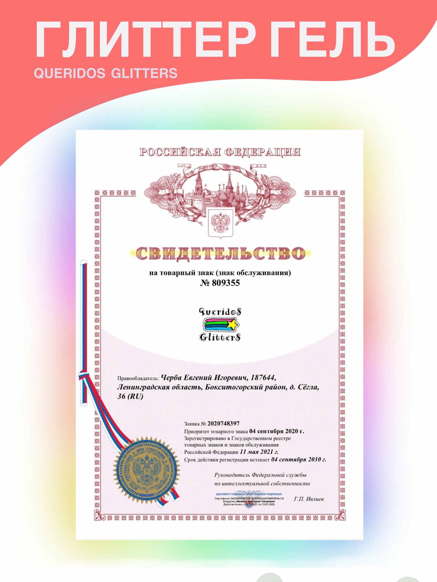 Queridos Glitters ГлиттерГель. Блёстки для лица и тела. Цвет "Любовь" 3 мл.