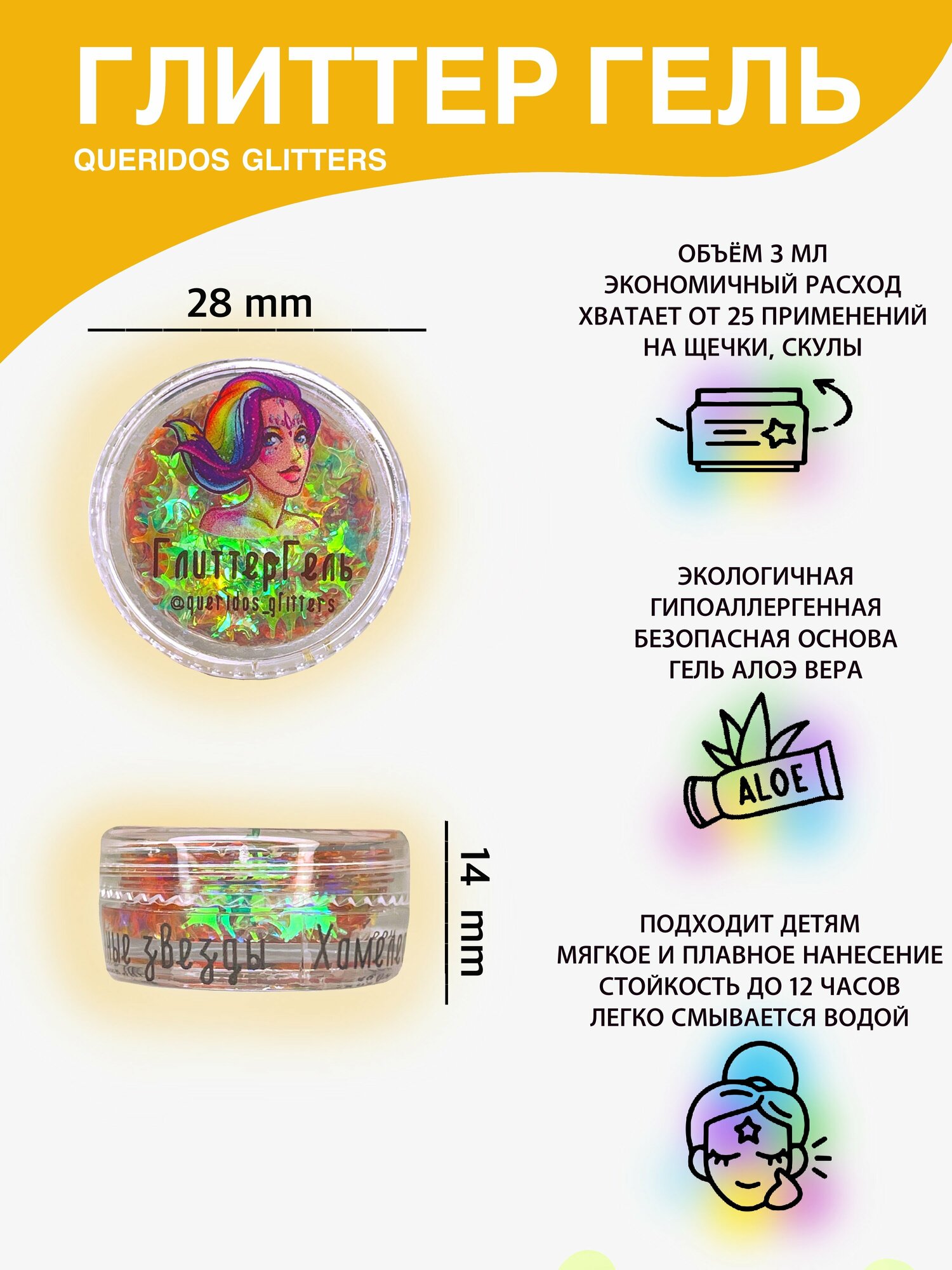 Queridos Glitters Глиттергель. Блёстки для лица и тела. Цвет "Венера" 3 мл.