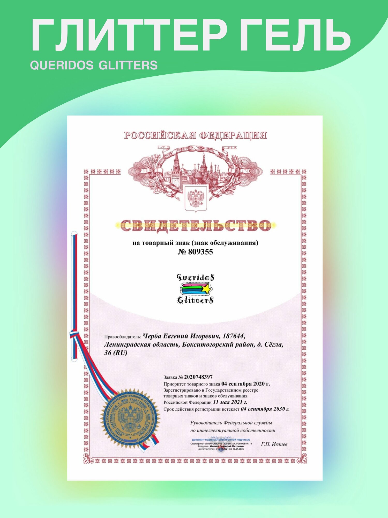 Queridos Glitters ГлиттерГель. Блёстки для лица и тела. Цвет "Трава" 3 мл.