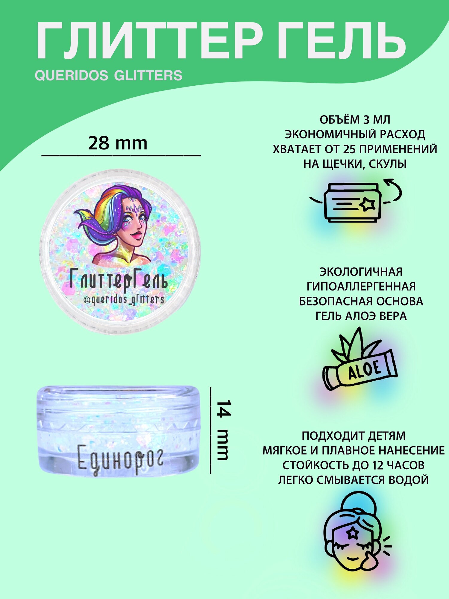 Queridos Glitters ГлиттерГель. Блёстки для лица и тела. Цвет "Мята" 3 мл.