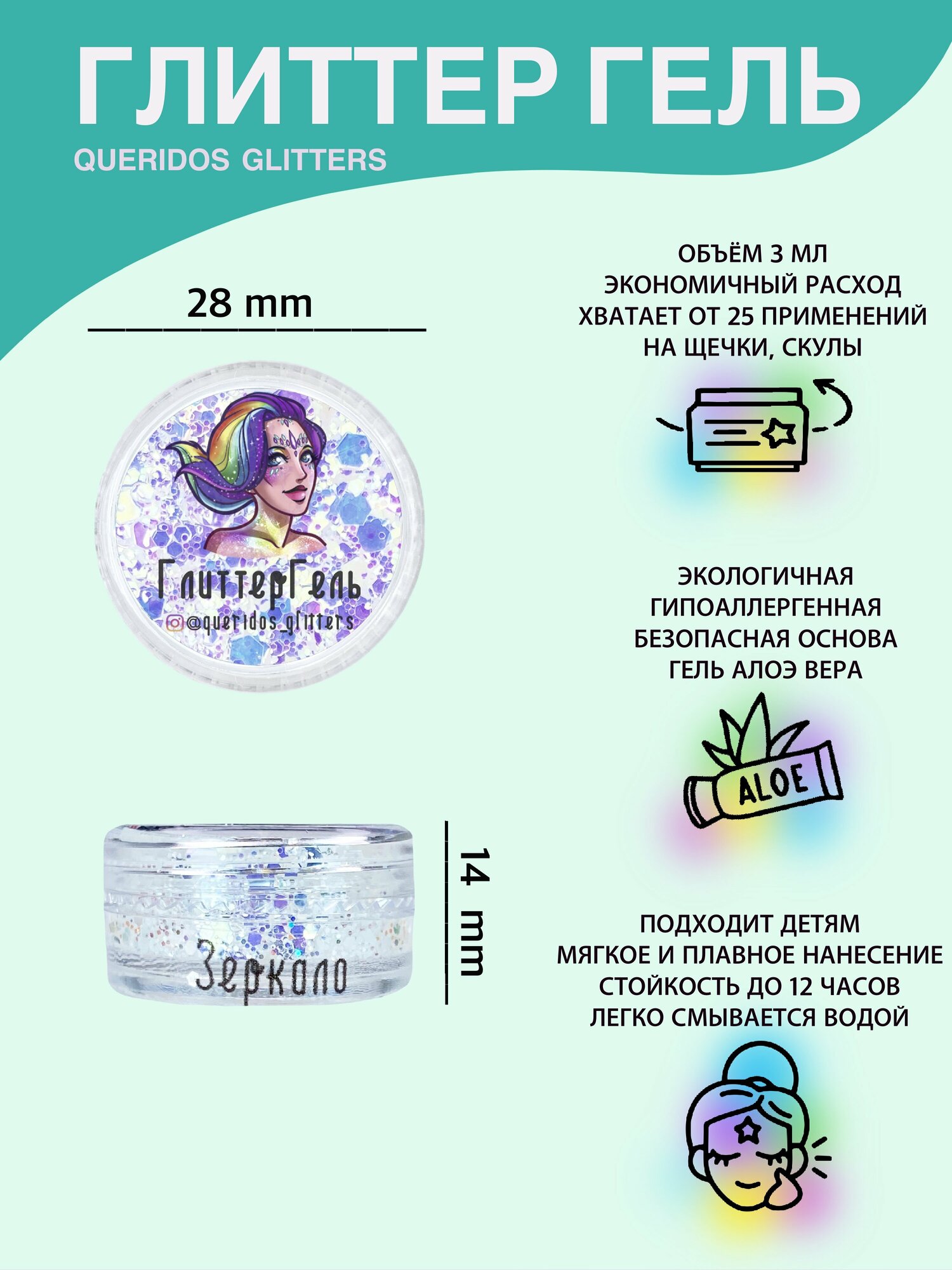Купить Queridos Glitters ГлиттерГель. Блёстки для лица и тела. Цвет "Зеркало" 3 мл.