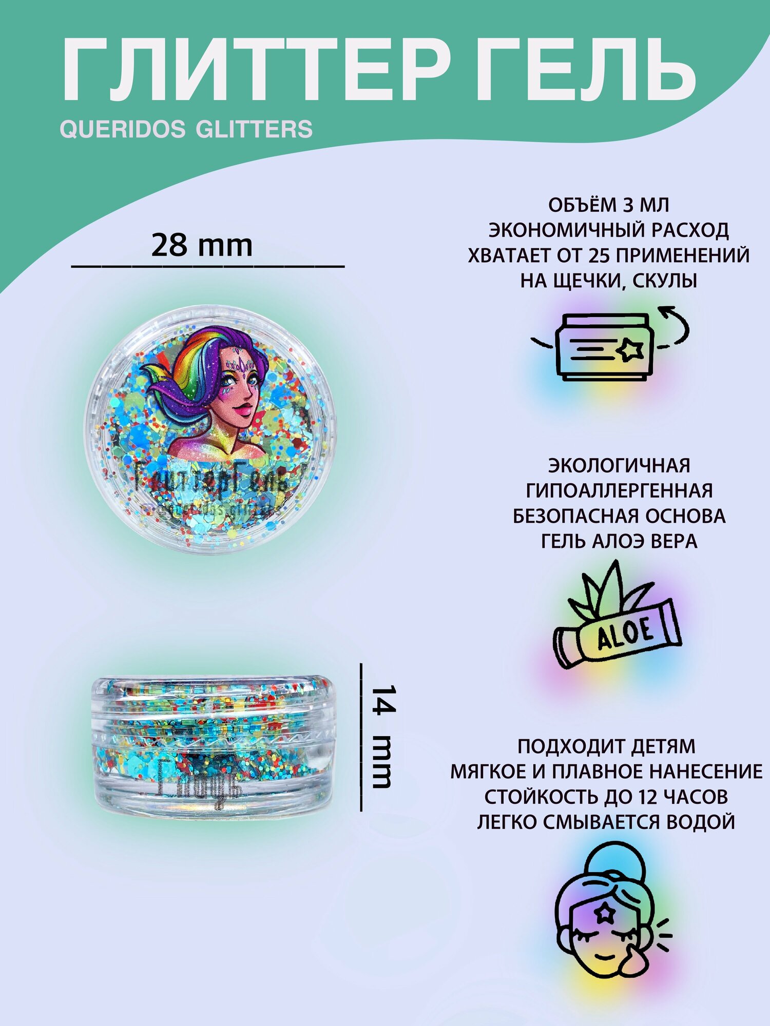 Queridos Glitters ГлиттерГель. Блёстки для лица и тела. Цвет "Мята" 3 мл.
