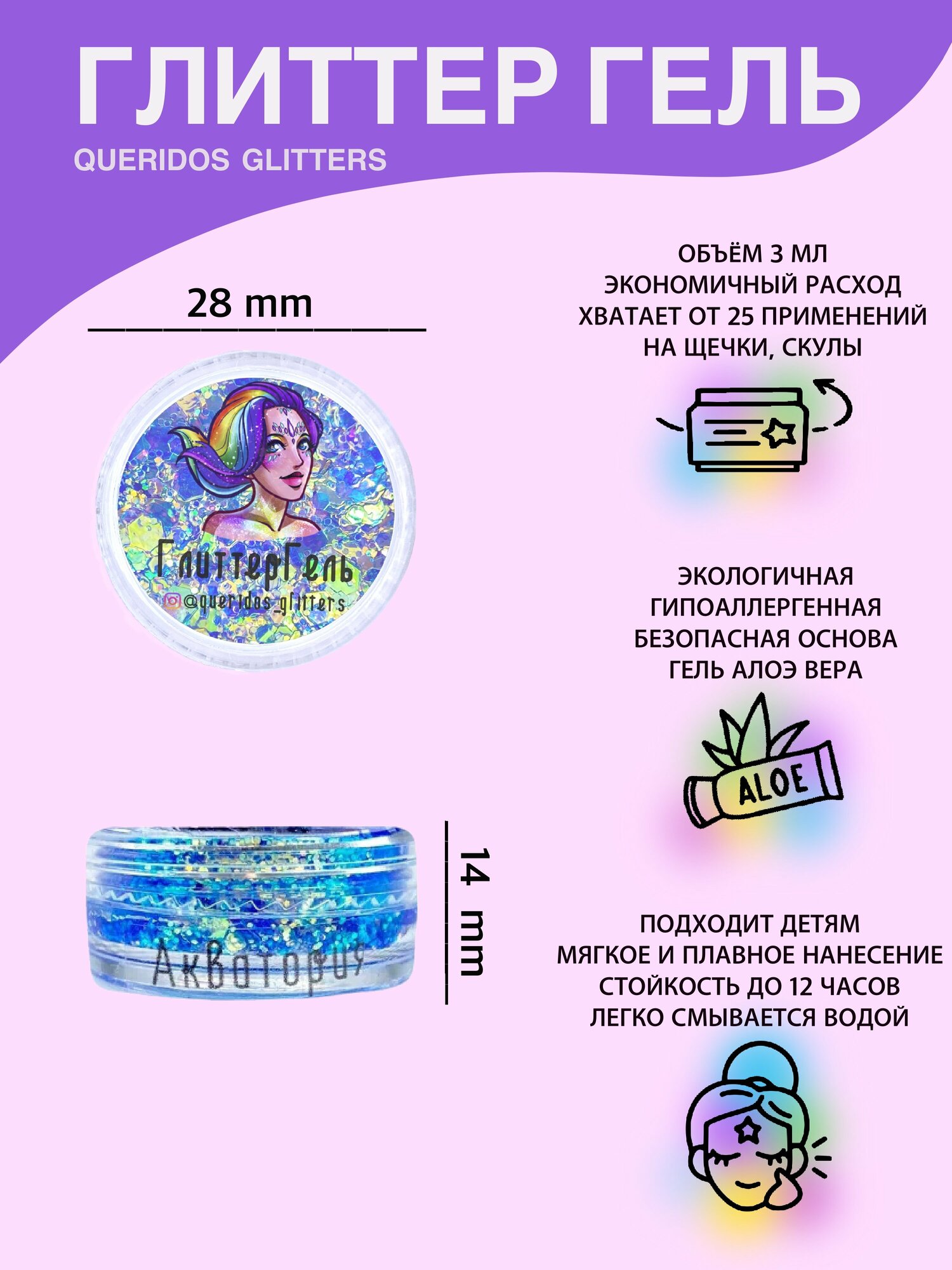 Queridos Glitters ГлиттерГель. Блёстки для лица и тела. Цвет "Мир" 3 мл.