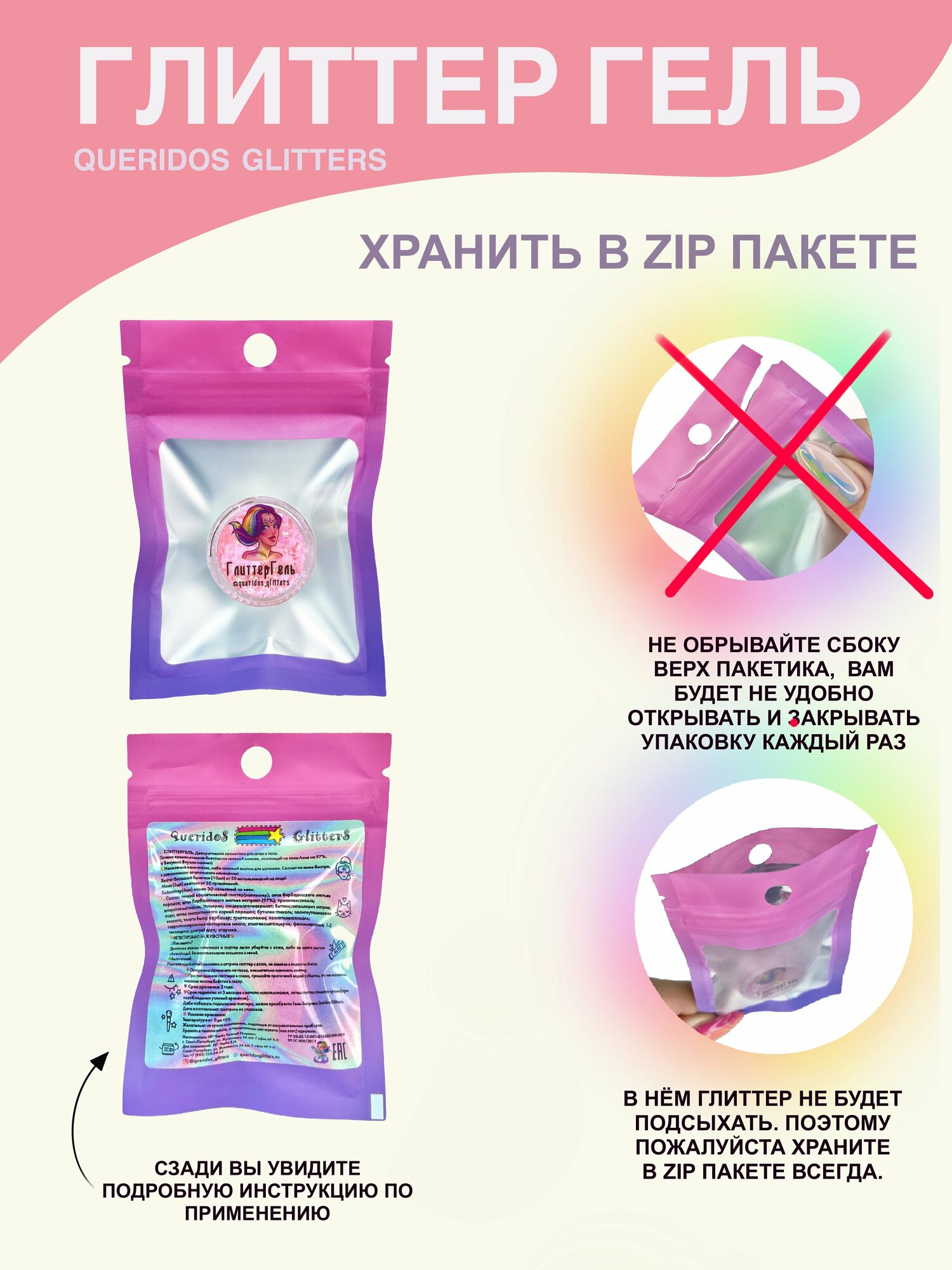 Queridos Glitters ГлиттерГель. Блёстки для лица и тела. Цвет "Глянец" 3 мл.