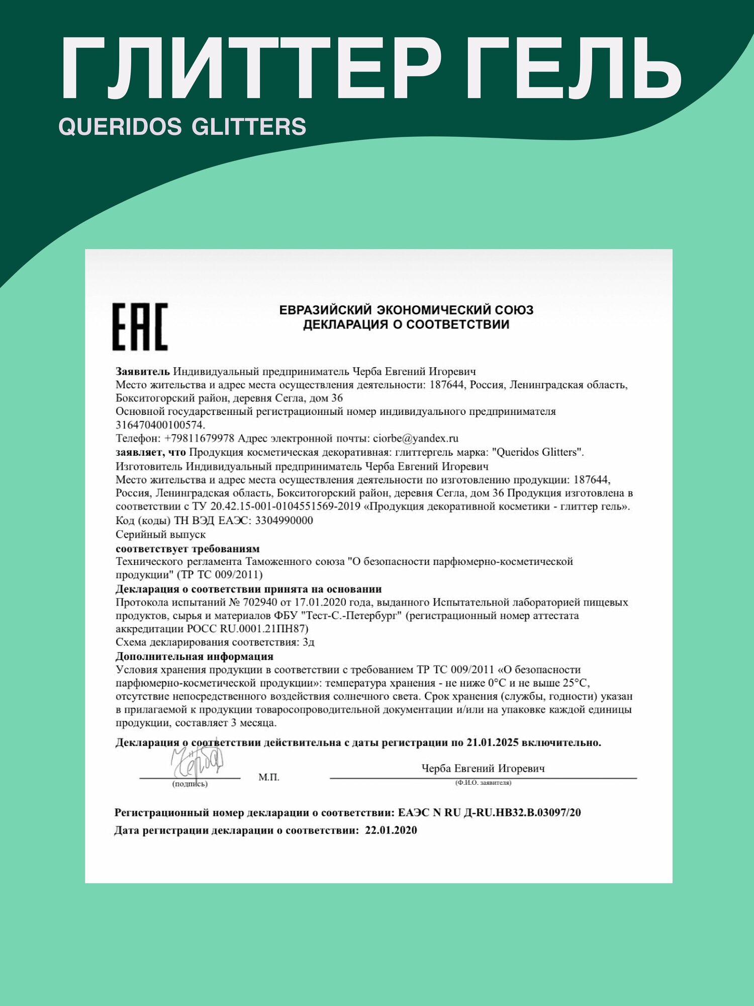Queridos Glitters ГлиттерГель. Блёстки для лица и тела. Цвет "Бирюза" 3 мл.