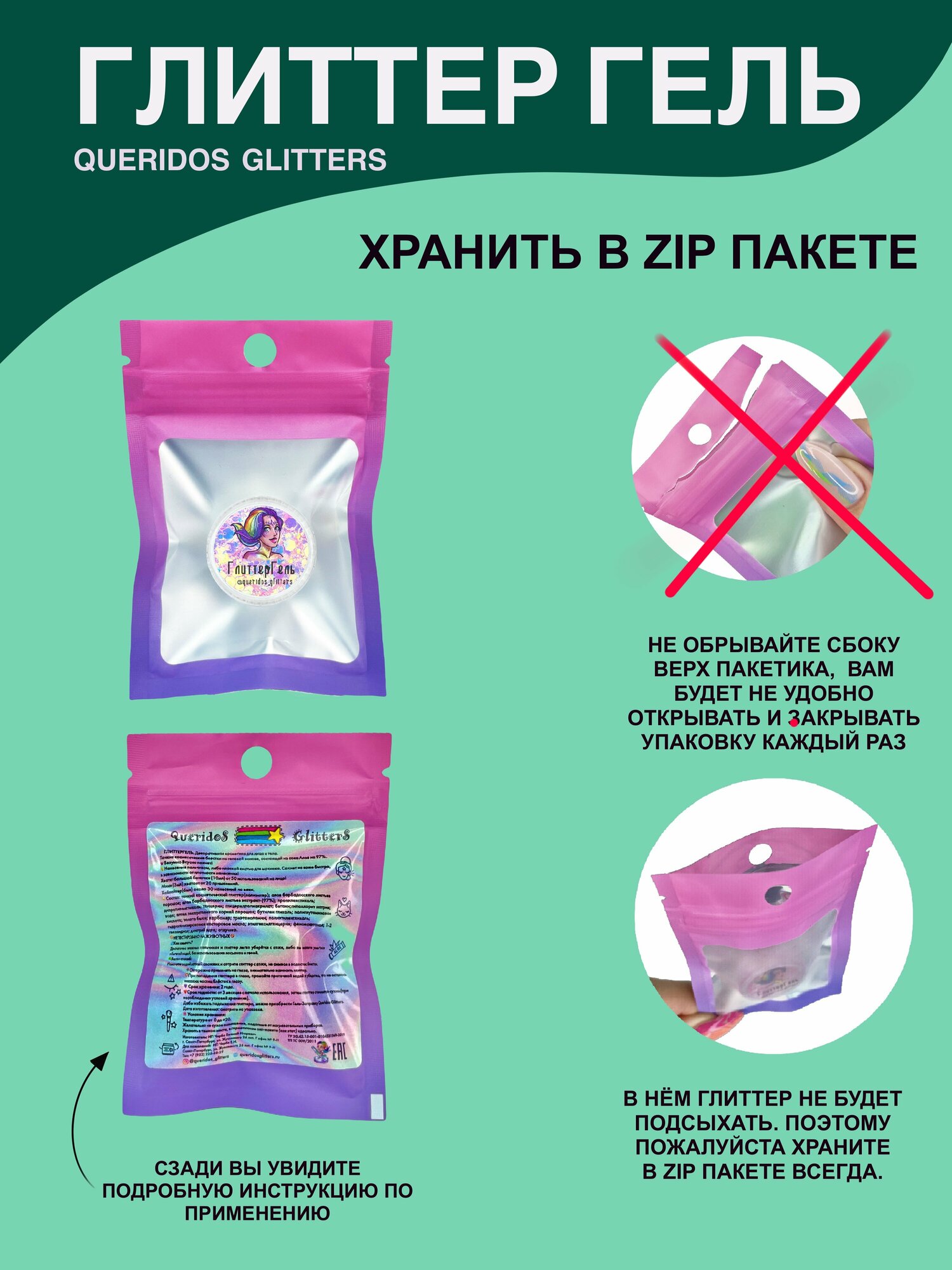 Queridos Glitters ГлиттерГель. Блёстки для лица и тела. Цвет "Глянец" 3 мл.