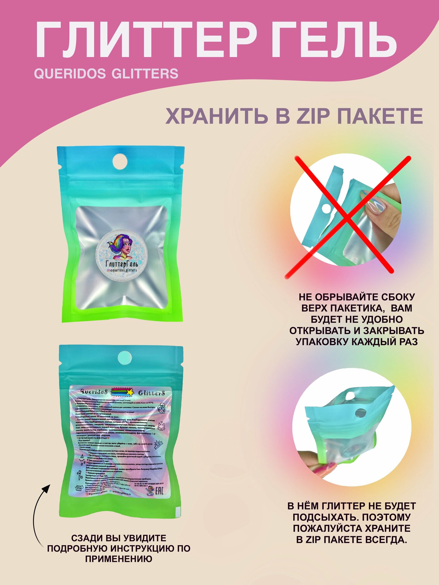 Queridos Glitters ГлиттерГель. Блёстки для лица и тела. Цвет "Глянец" 3 мл.