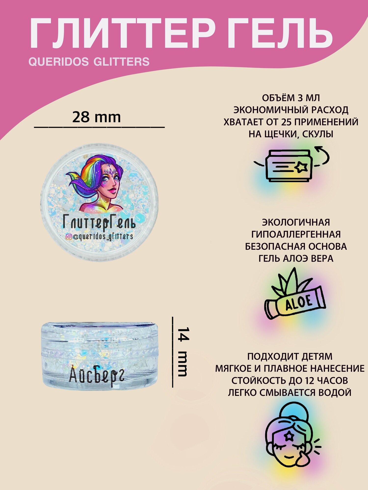 Купить Queridos Glitters ГлиттерГель. Блёстки для лица и тела. Цвет "Айсберг" 3 мл.