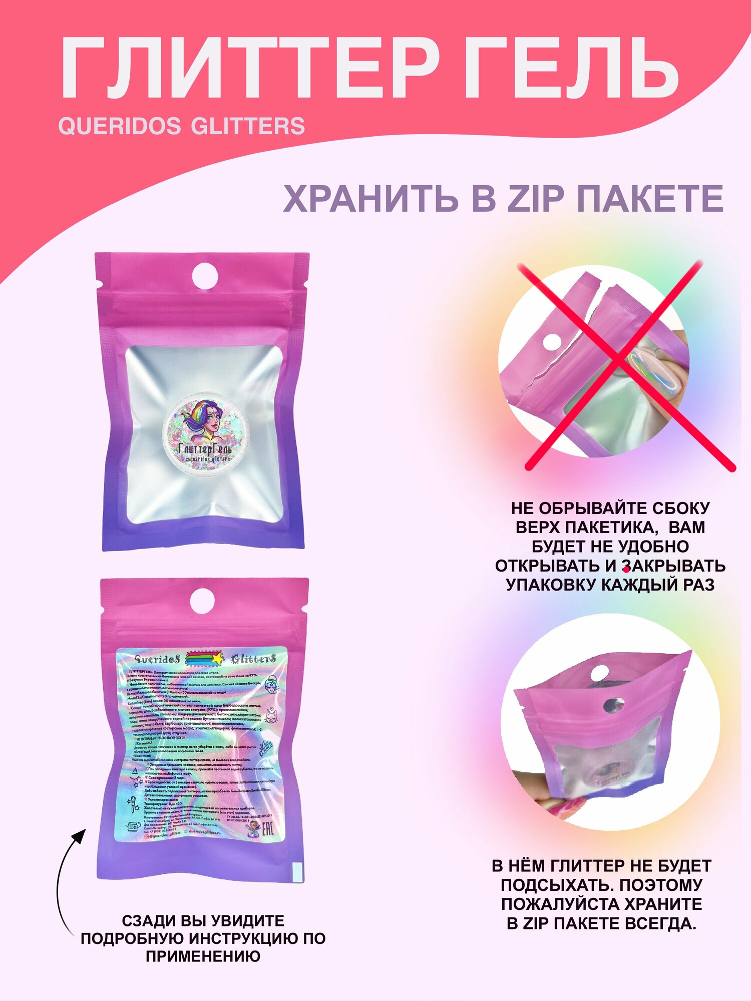 Queridos Glitters ГлиттерГель. Блёстки для лица и тела. Цвет "Глянец" 3 мл.