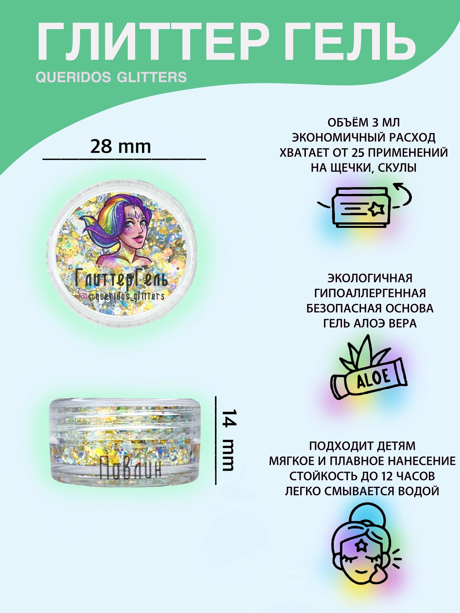 Queridos Glitters ГлиттерГель. Блёстки для лица и тела. Цвет "Мята" 3 мл.
