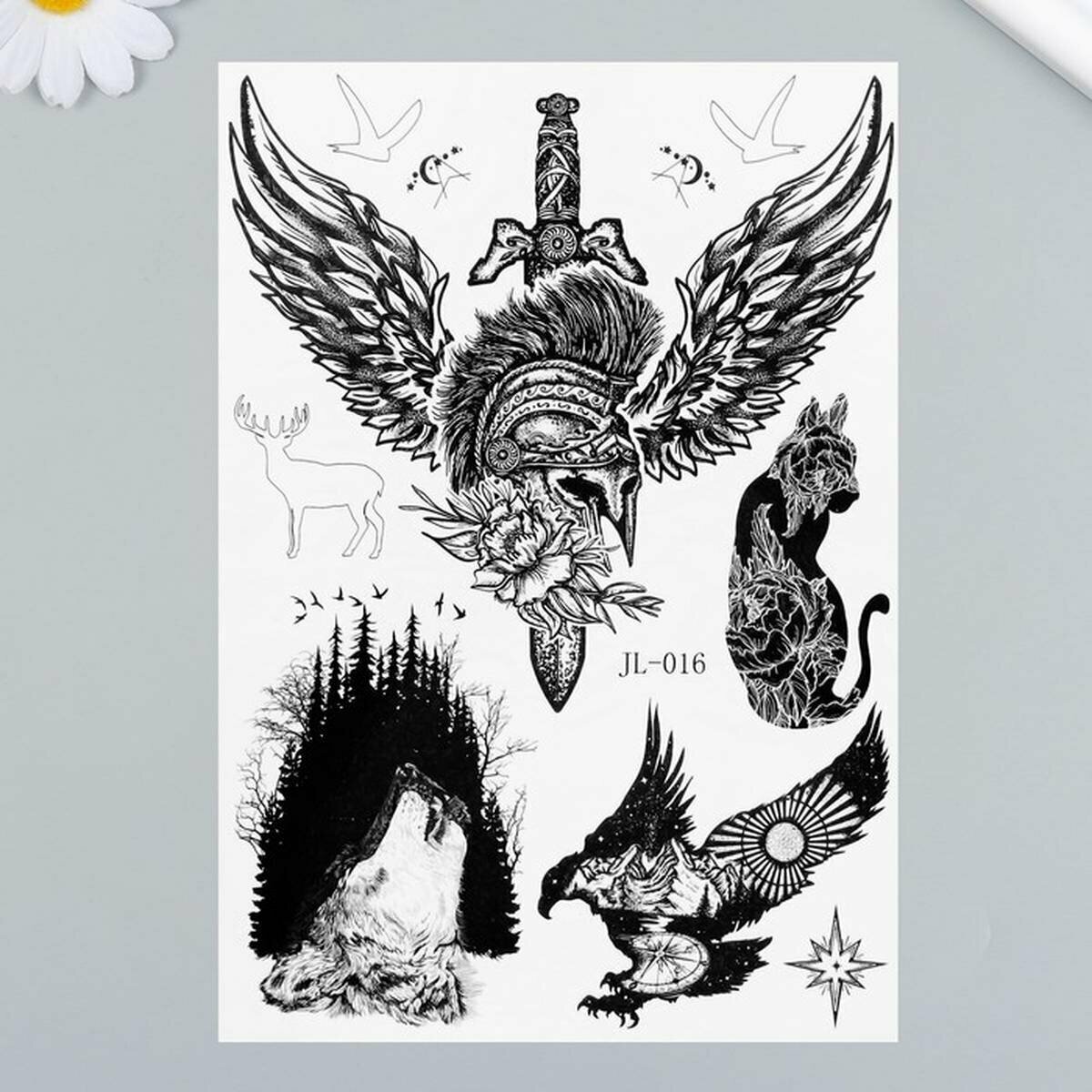 Татуировка на тело черная "Кинжал, шлем и крылья" 21х14.8 см, 1 шт. интересное: