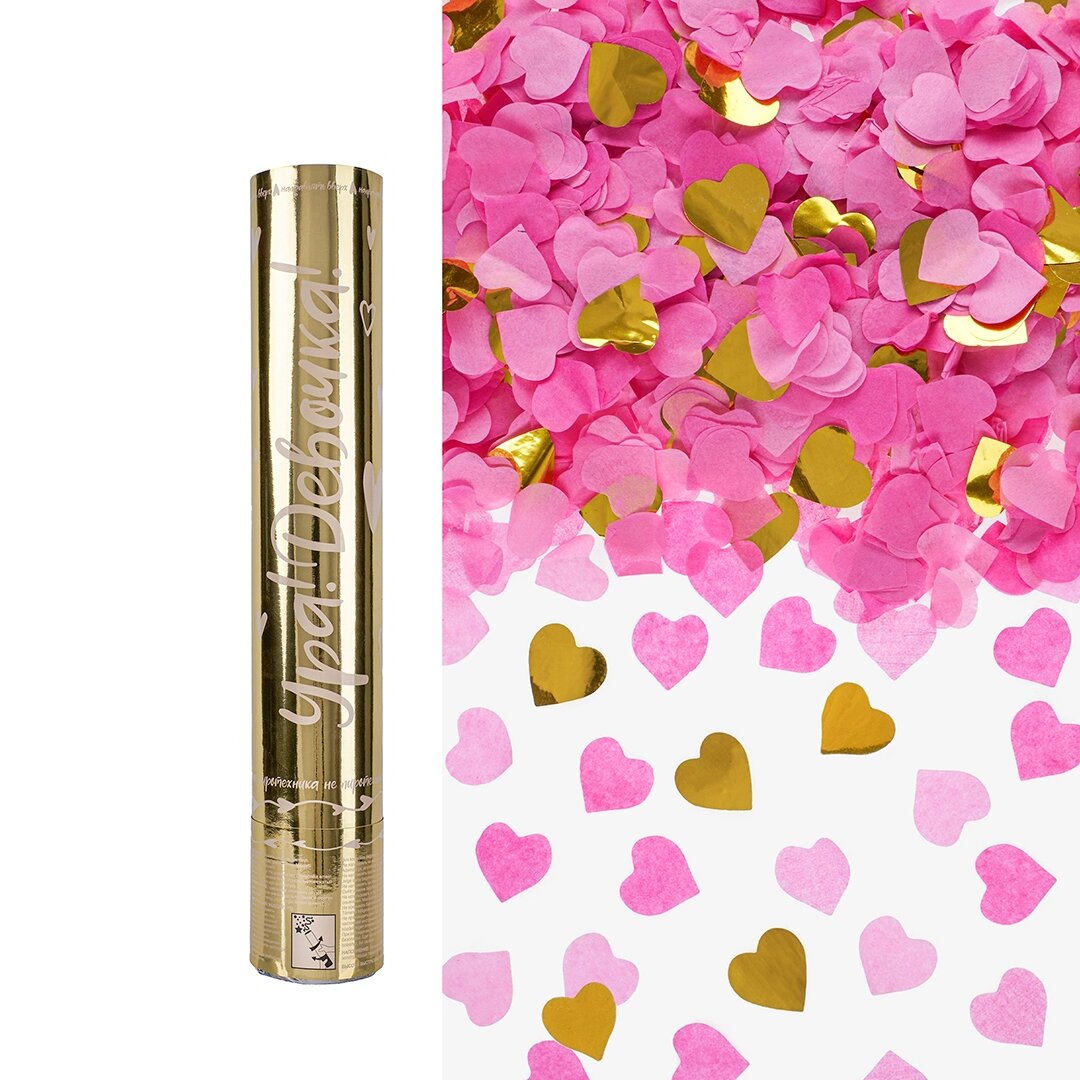 Пневмохлопушка (12/30 см), Гендер Пати, Ура, Девочка, Сердца фольга и тишью, Розовый/Золото, 1 шт. интересное: