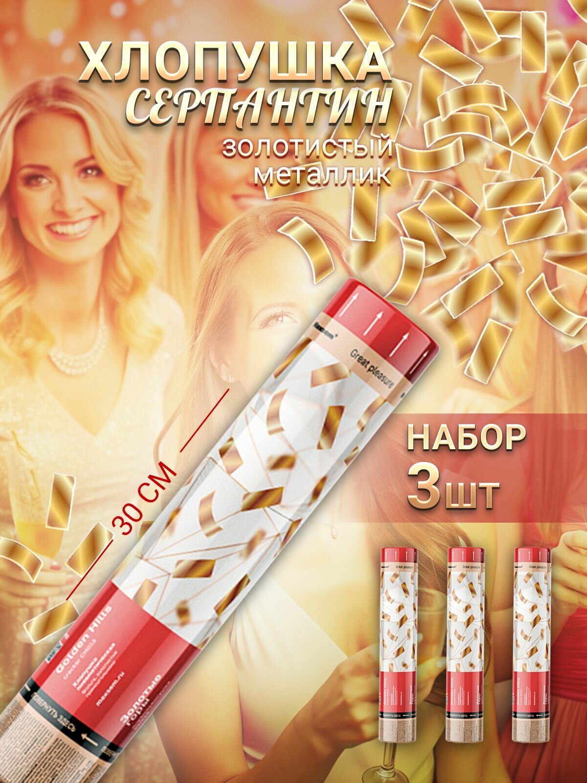 Купить Пневматическая хлопушка на праздник Золотые полоски конфетти, 30 см, в наборе 3 штуки