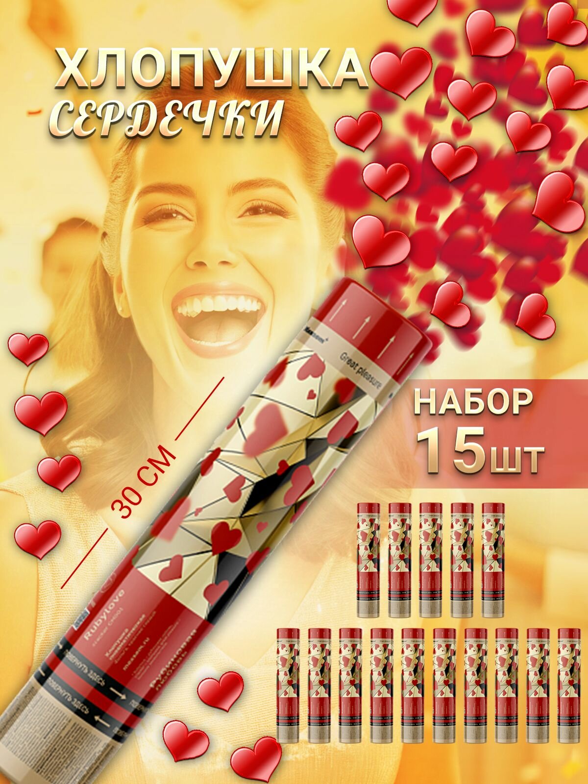 Купить Пневматическая хлопушка на праздник Сердца Фольга, Красные сердечки 30 см, в наборе 15 штук