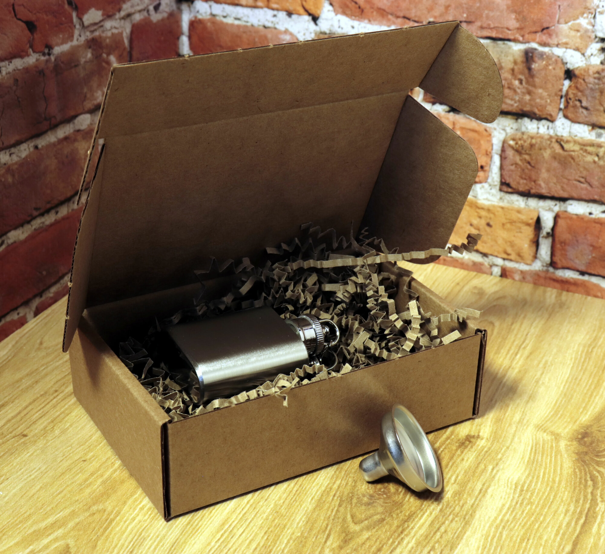 Металлическая фляжка (145 мл), воронка. Коробка с наполнителем. "Поручикъ Фляжкин"
