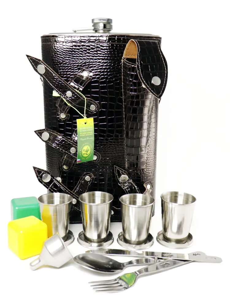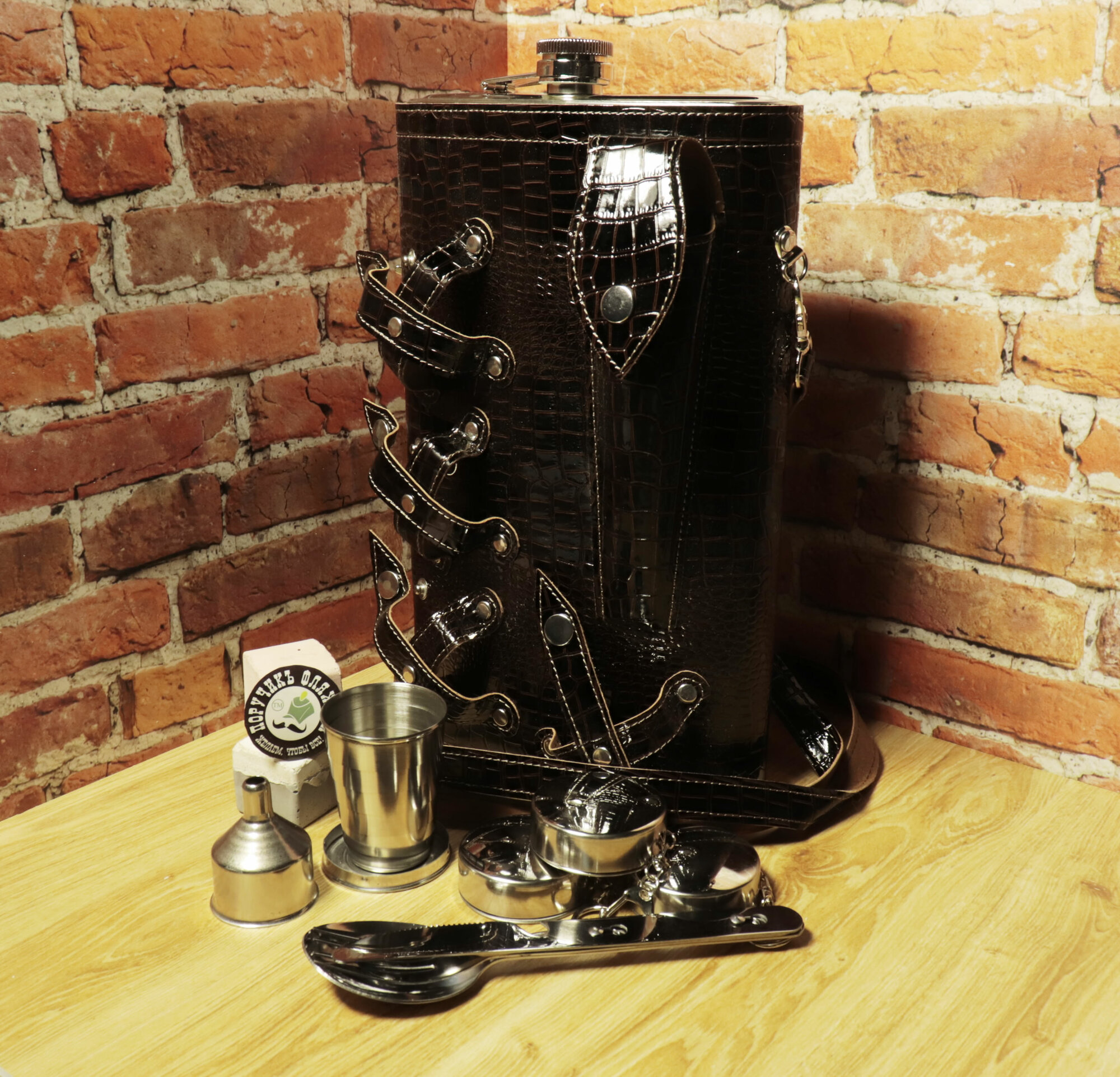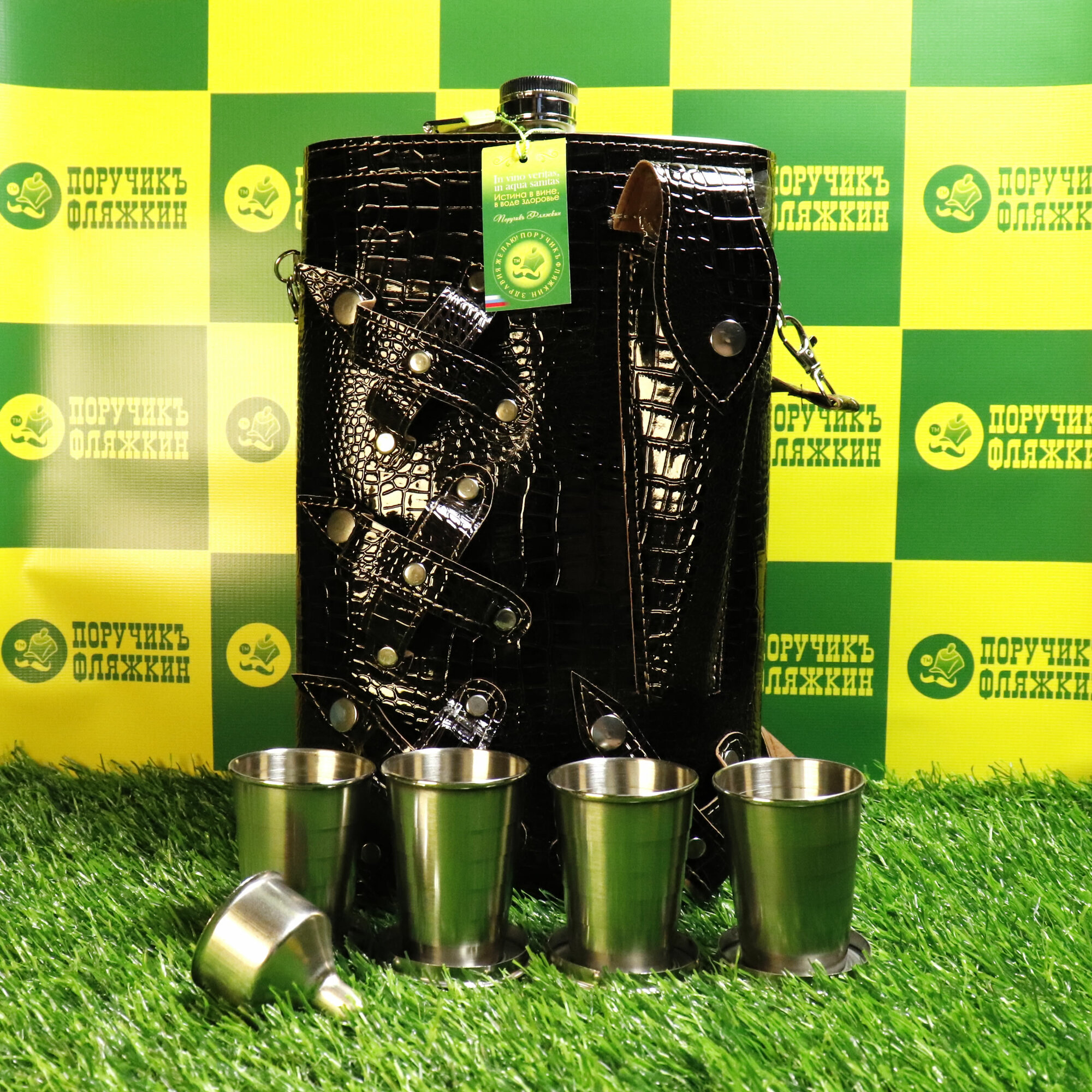 Фляжка (1,22л) в чехле, три стопки, мульти-набор, фонарик с указкой, воронка. Поручикъ Фляжкин