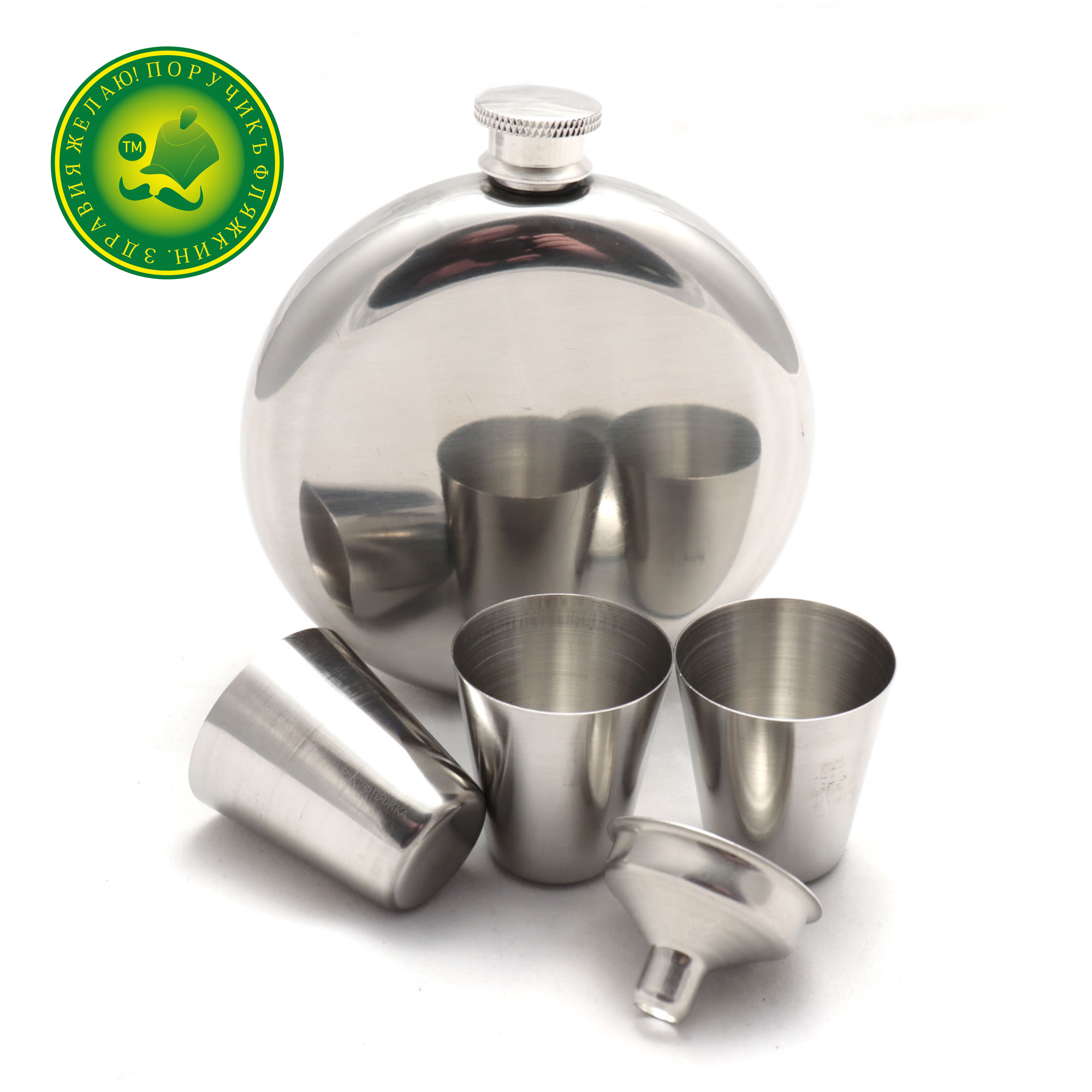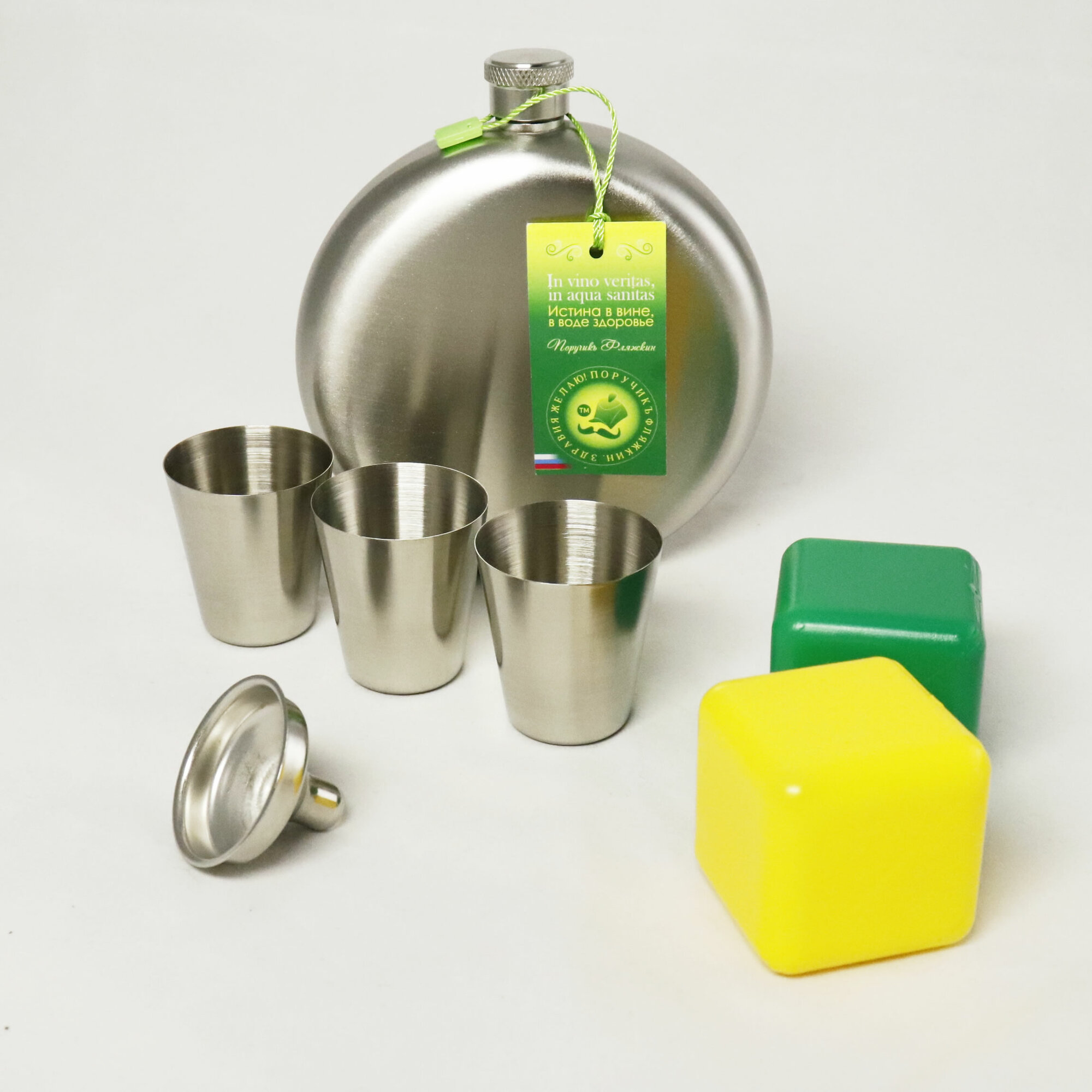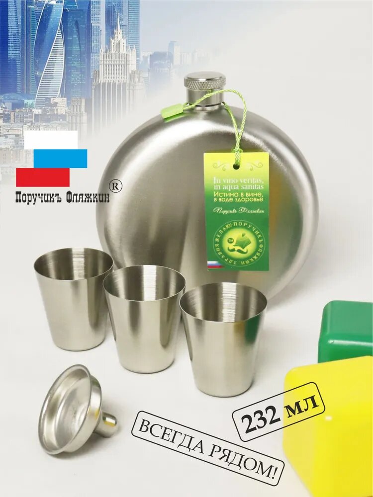 Круглая фляжка (232 мл), три стопки (30 мл) и воронка. Поручикъ Фляжкин интересное: