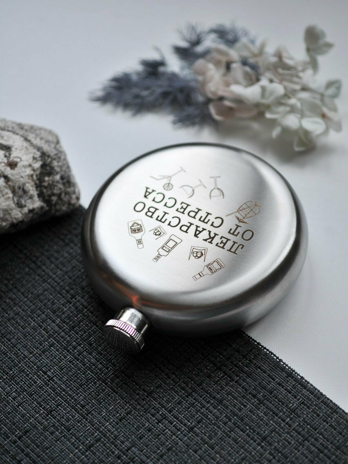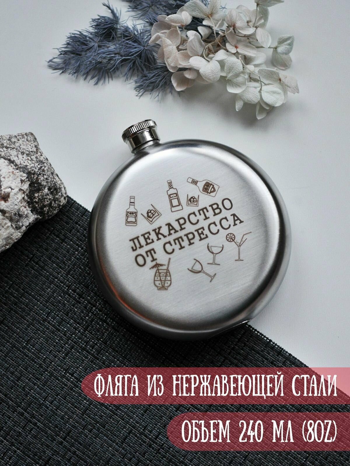 Фляга круглая металлическая RiForm с гравировкой "Лекарство от стресса", 240мл, нержавеющая сталь интересное: