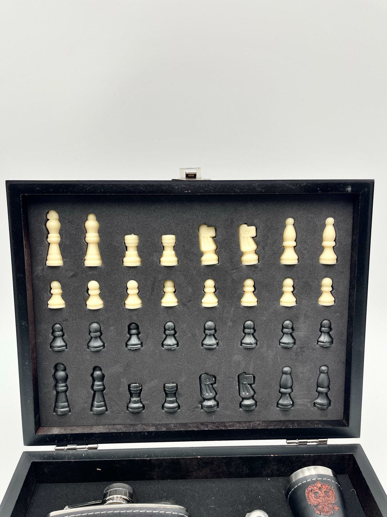 Подарочный набор 7 в 1: фляжка, 2 рюмки, воронка, шахматы, штопор 24х28 см. интересное:
