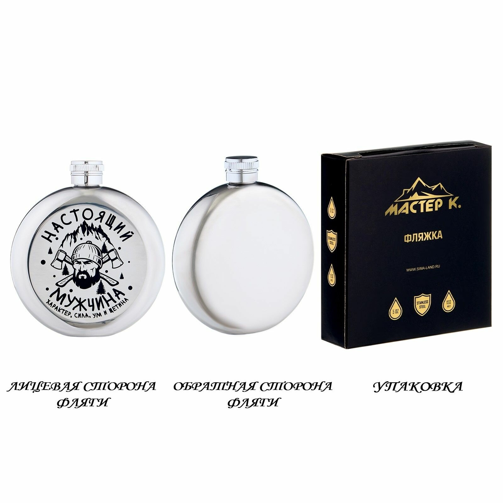 Фляжка для алкоголя Мужик , нержавеющая сталь, круглая, подарочная, 150 мл