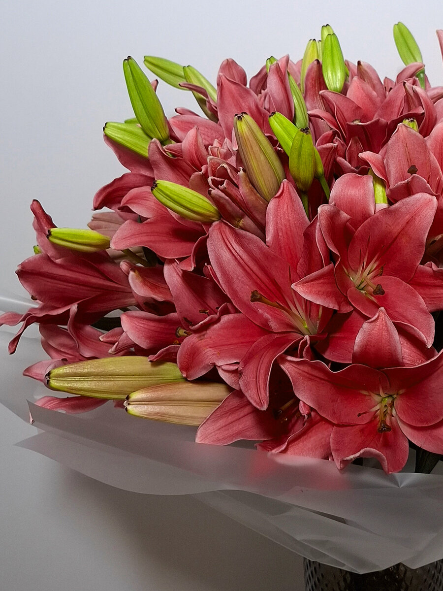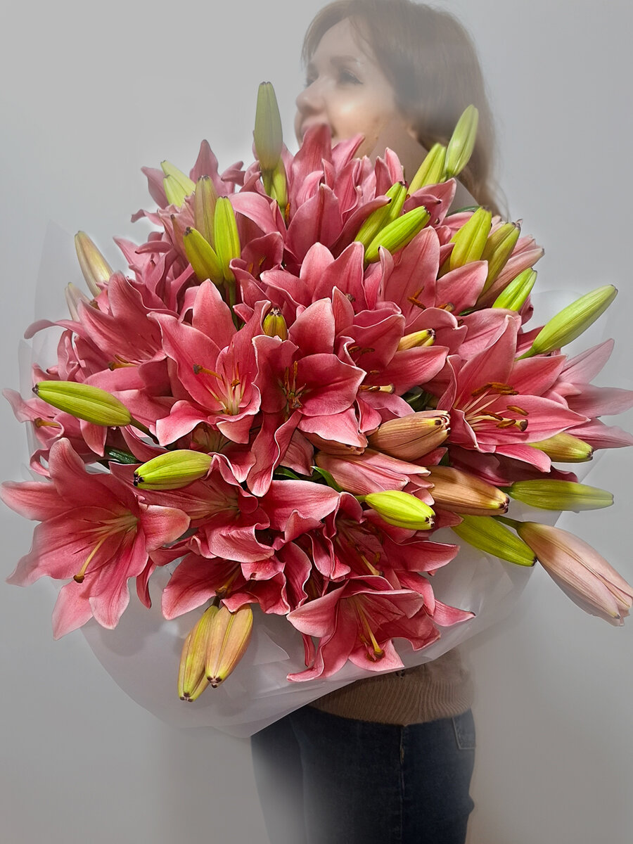 Монобукет крупных розовых лилий, 15 стеблей, высота 60 см. Florentika