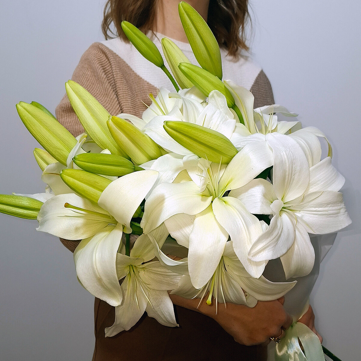 Монобукет крупных белых лилий, 15 стеблей, высота 60 см. Florentika